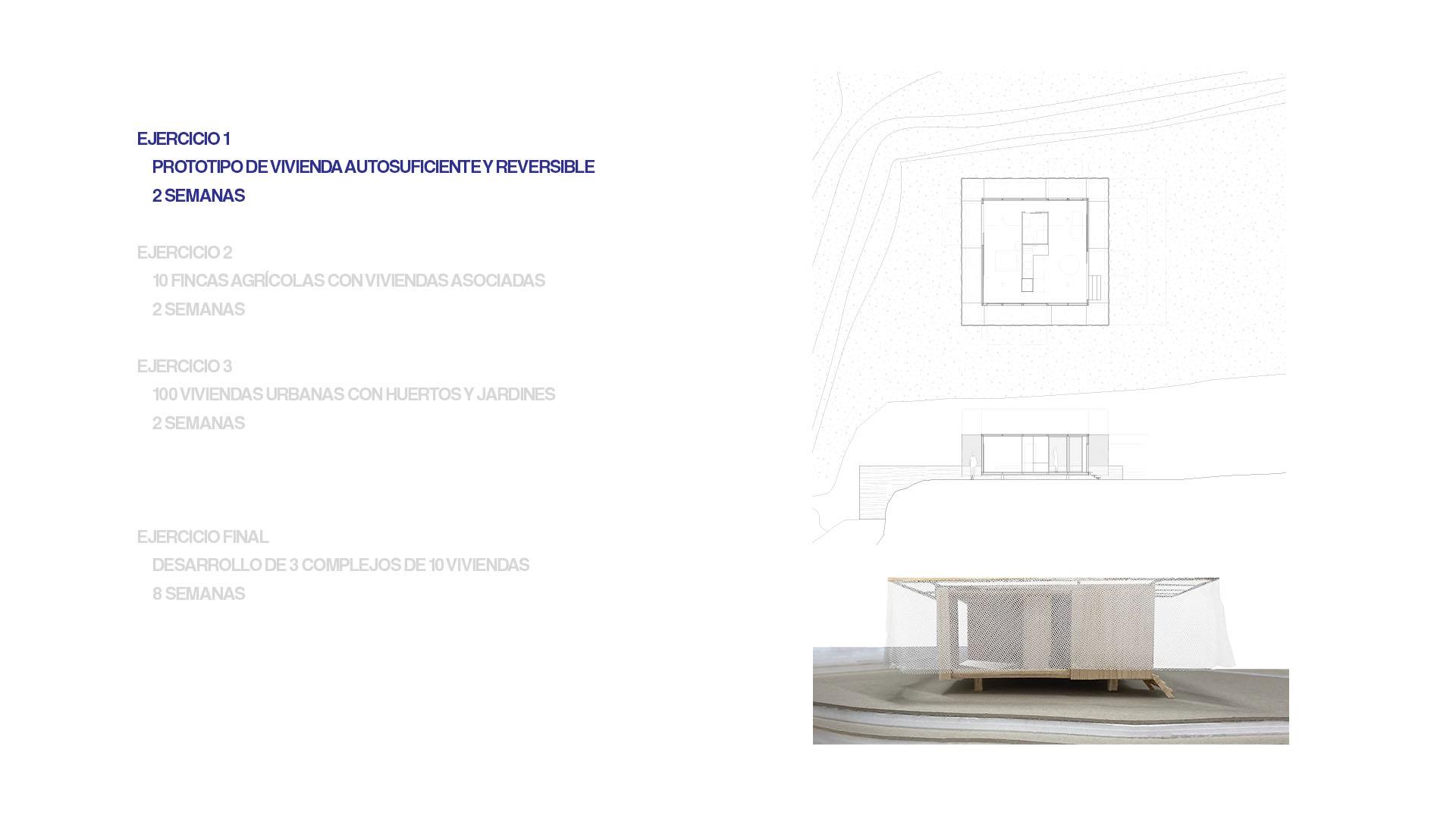 - El primero de ellos trata de la proyección de un prototipo de vivienda totalmente reversible y autosuficiente enérgicamente, de unas dimensiones determinadas (200m3), destinado al uso ocasional de 2-3 personas.