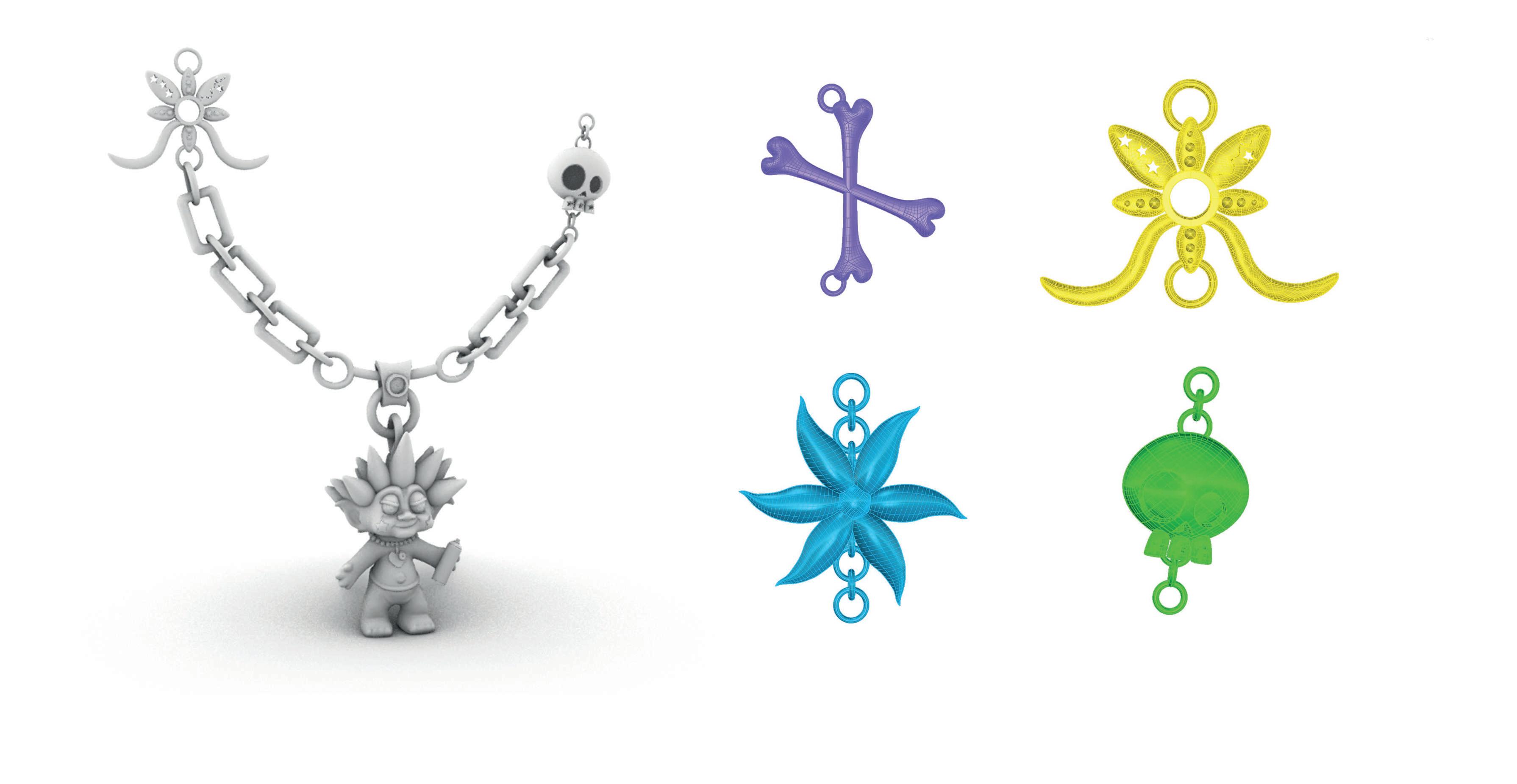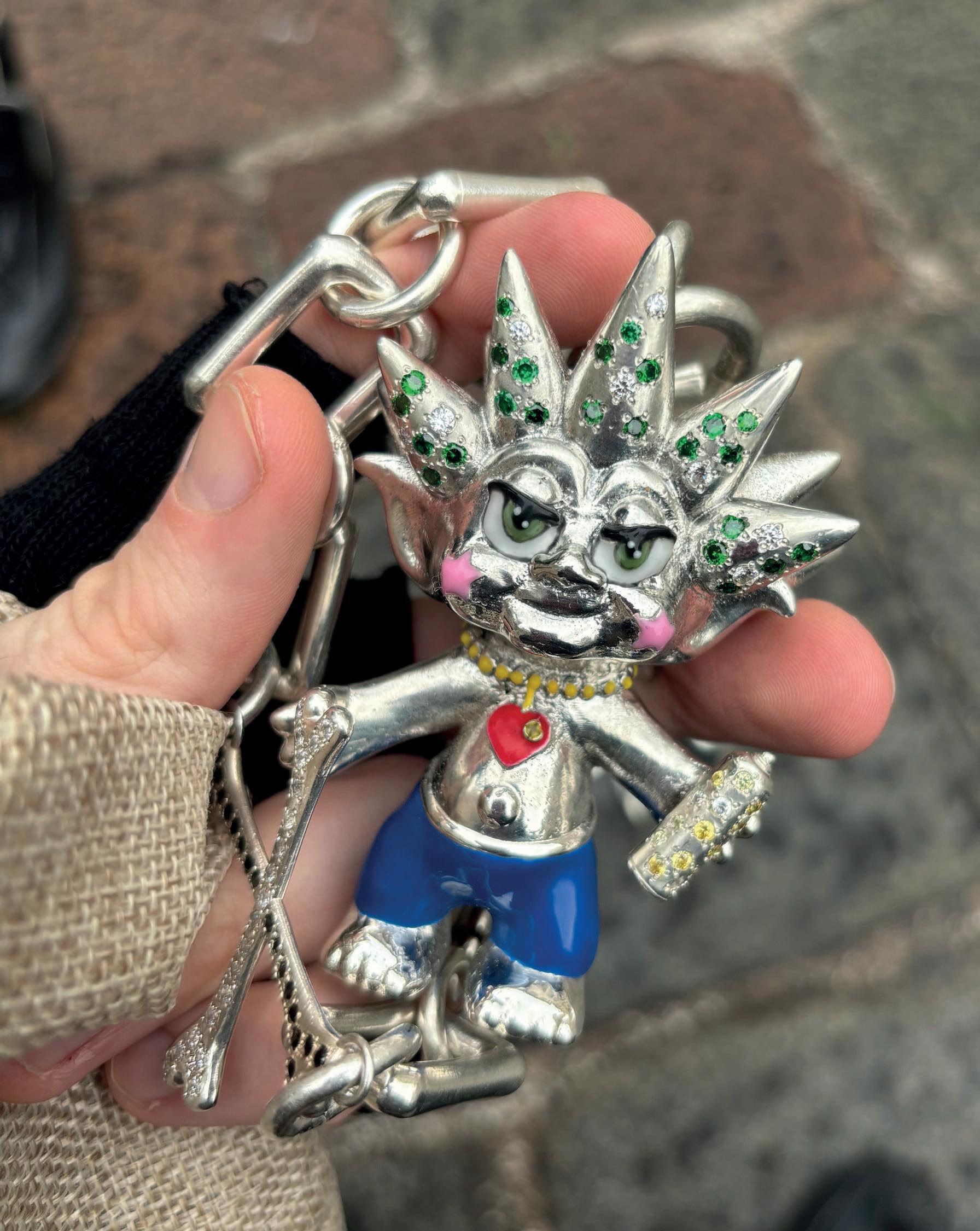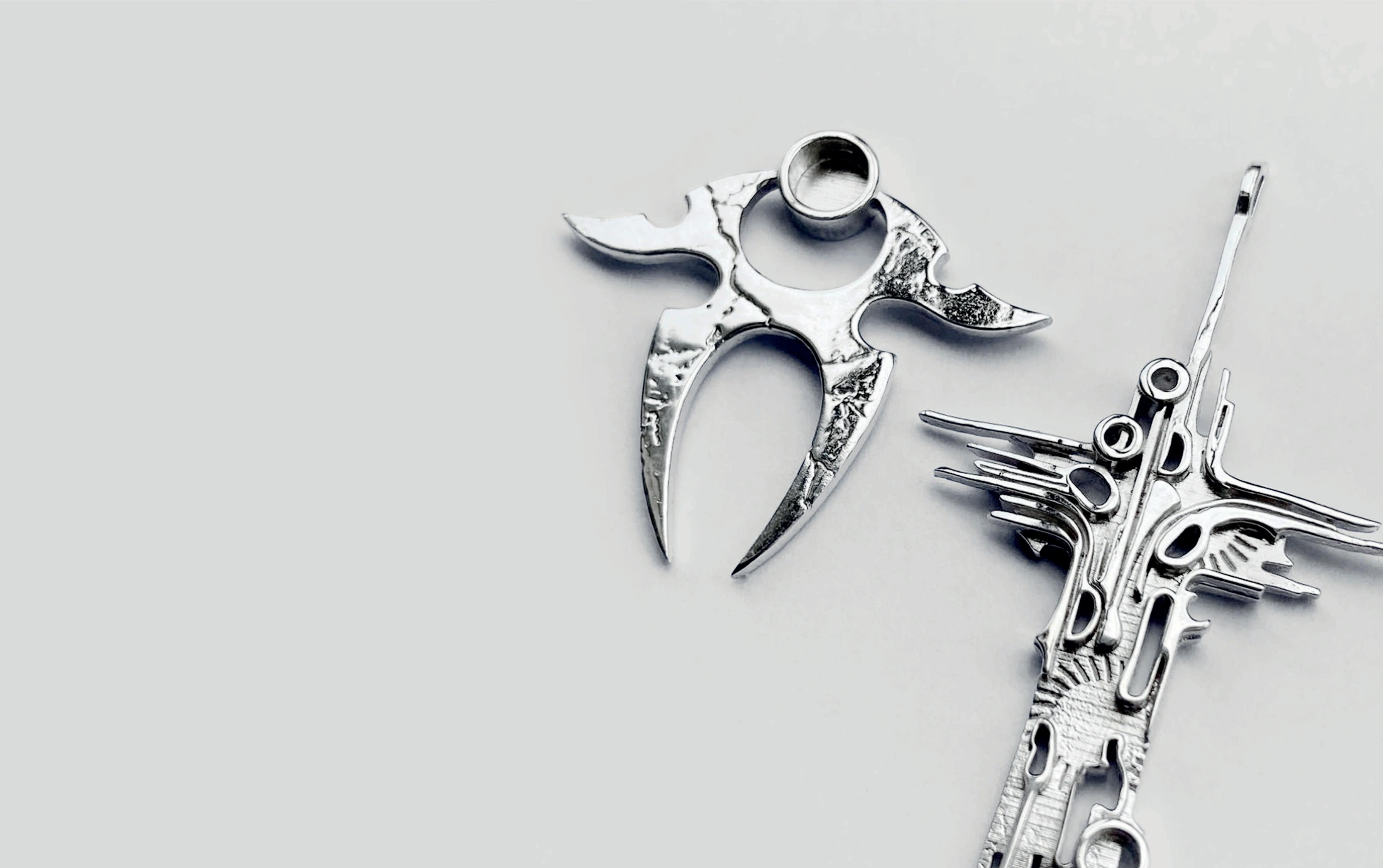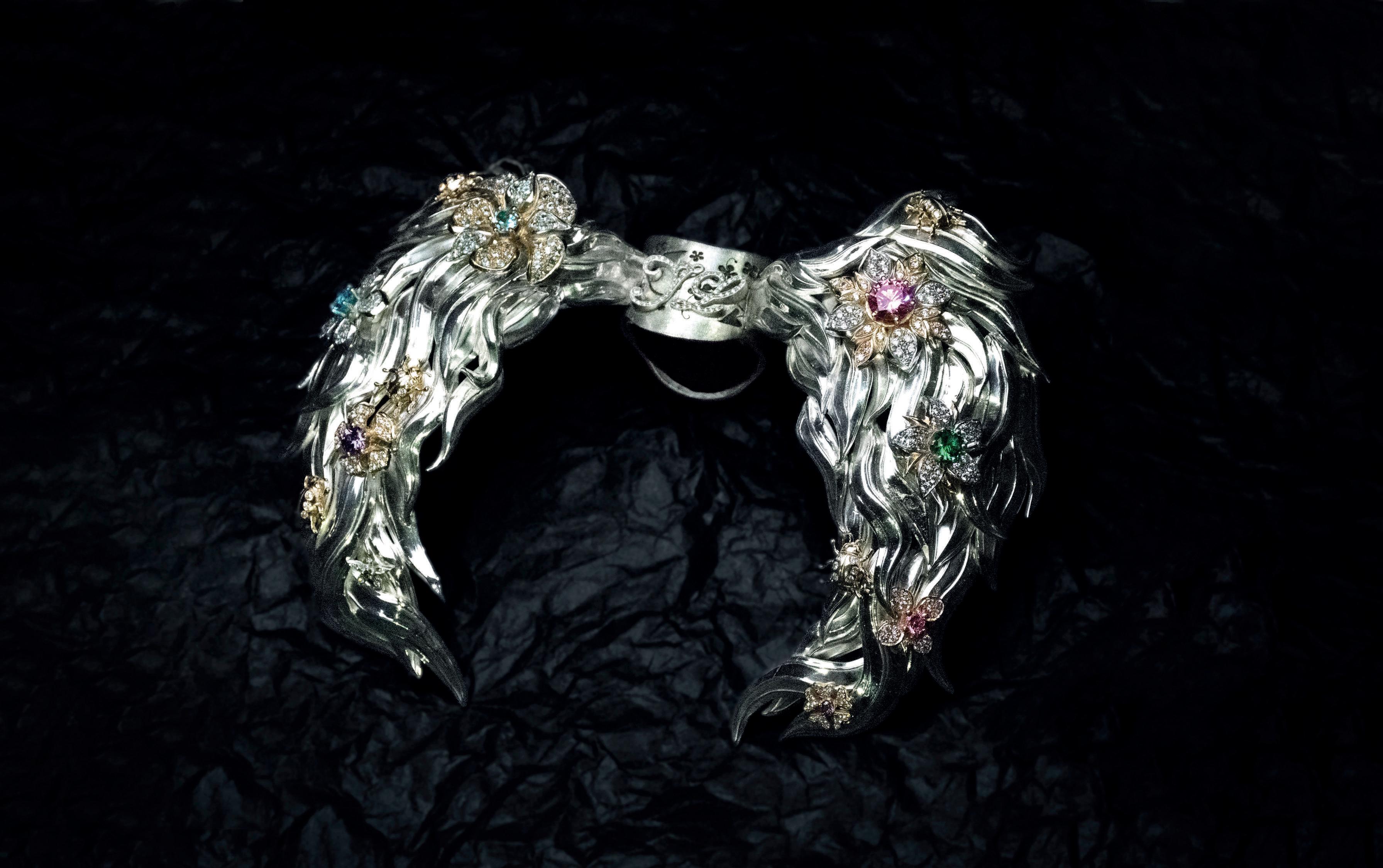 Custom 925 silver ‘wings’ working as a microphone application, designed to be a functional part of the swedish artist’s live performances and artistic vision. The wings are covered by flowers and little insects enamelled and embedded with gems in cold tones, with the aim of representing a childish, fantasy and cartoony world. The piece is composed by the fusion of three different 3D printed parts ( the wings and the bridge), as a manifestation of this technology’s power and efficiency.