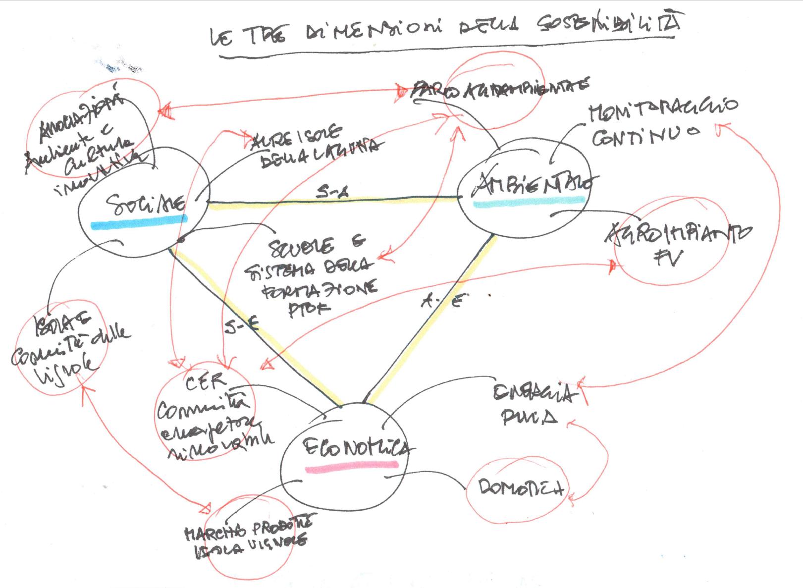 Lo schema suggerisce le connessioni tra le dimensioni sociale e ambientale con le varie articolazioni del progetto, così come quelle tra dimensione economica e quella ambientale ad esempio tra energia pulita e monitoraggio ambientale.