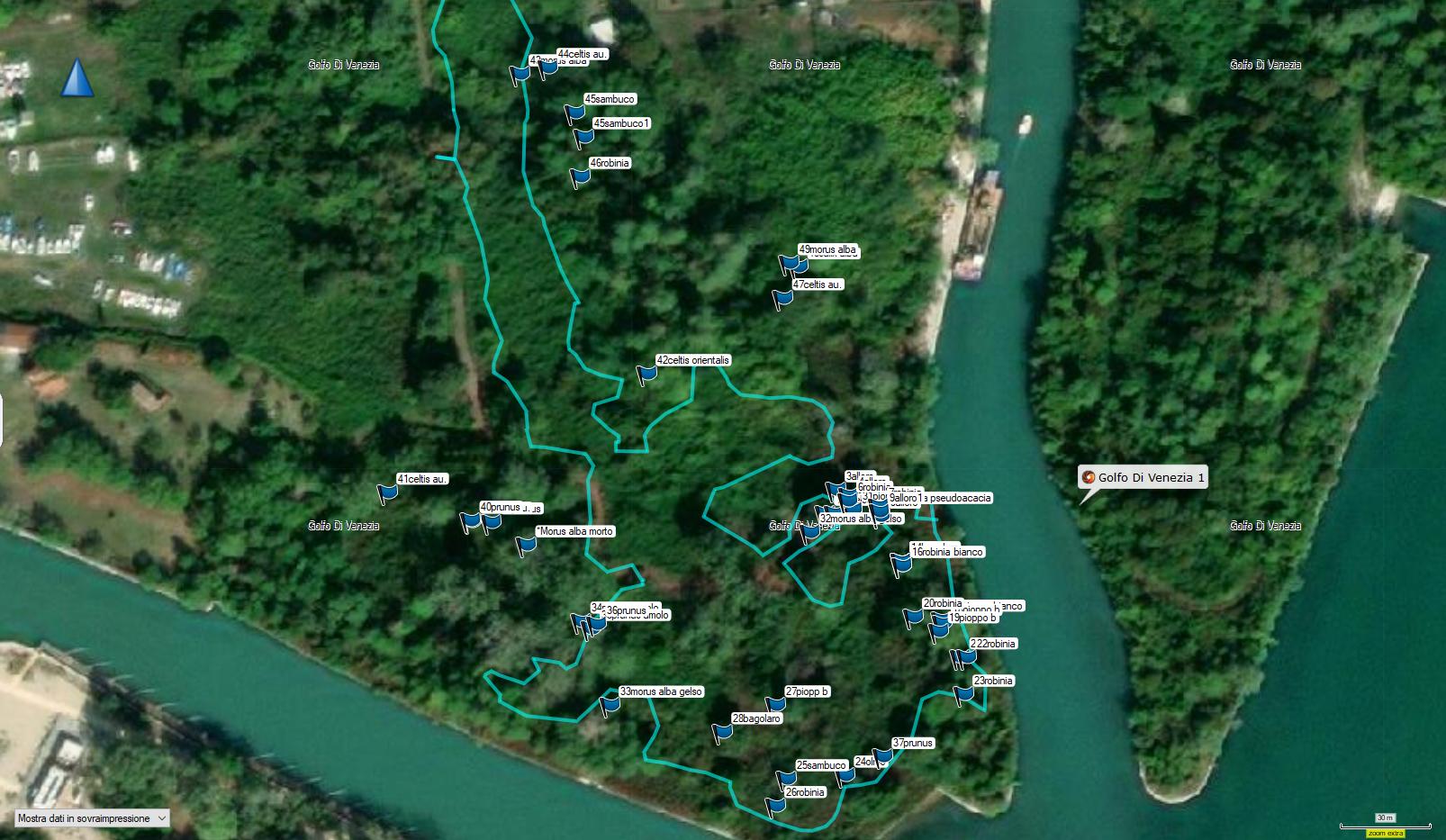 Alla fine delle diverse giornate in cui ha lavorato il cingolato è stato realizzato il rilievo gps-gpx dell’area pulita, per il controllo dell’area già lavorata per la definizione del lavoro nella giornata successiva. Al termine della settimana è stato fatto il bilancio definitivo e tracciato il confine dell’area complessivamente trattata