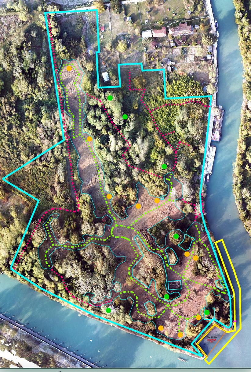 Questo è lo schema della destinazione d’uso dell’area che cerca di interpretare la struttura fisica attuale dell’area, e i possibili diversi utilizzi in ragione della segmentazione della morfologia e dei sub paesaggi locali. Paesaggi locali determinati dalle tipologie delle alberature e del verde, dalle altezze diverse delle chiome, dall’alternanza tra volumi verdi e aree prive di vegetazione, dalle diverse quote di livello del terreno.