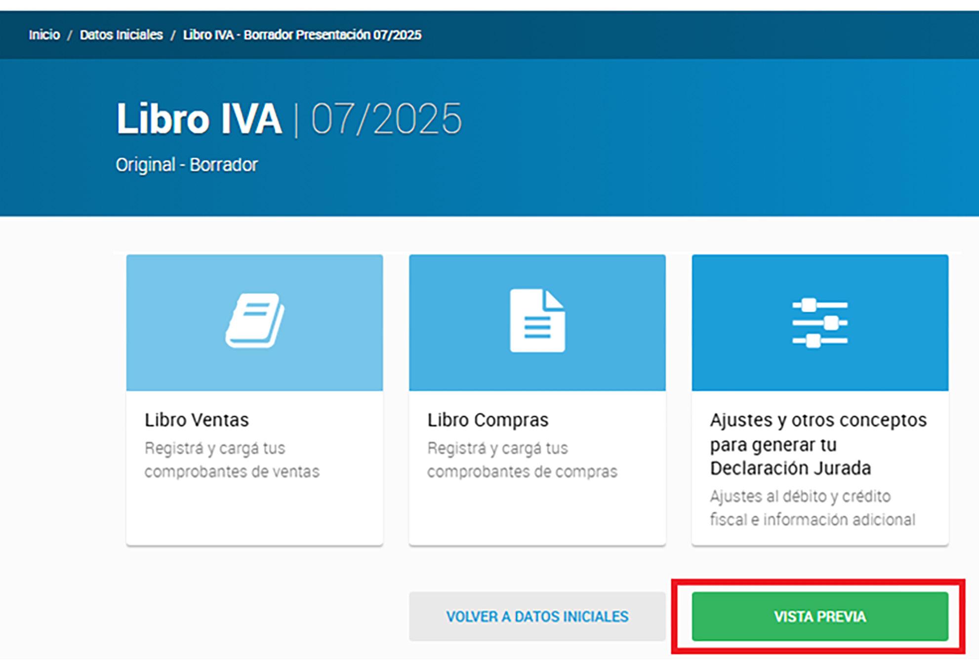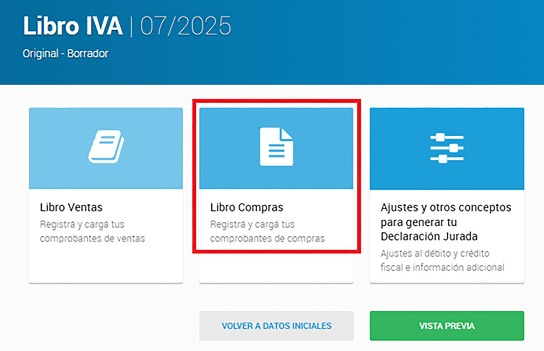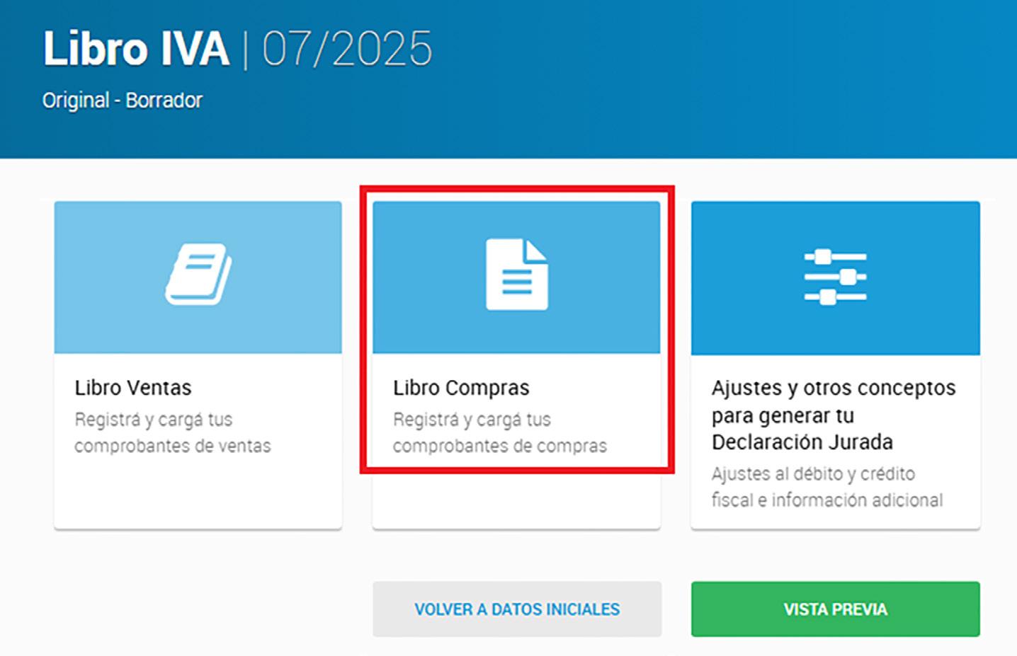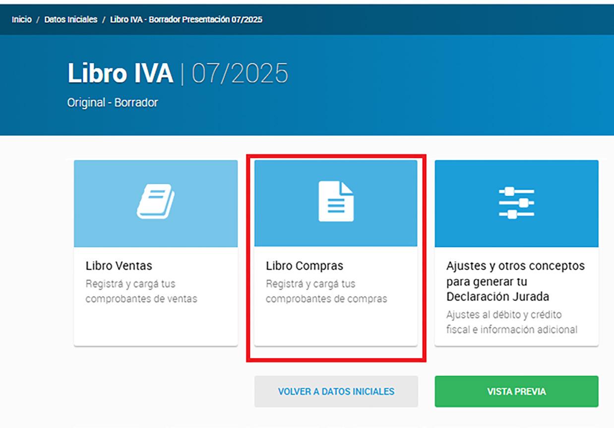 Luego se desplegará el Libro IVA con sus 3 opciones: “Libro Ventas”, “Libro Compras” y “Ajustes y otros conceptos para generar la declaración jurada”.