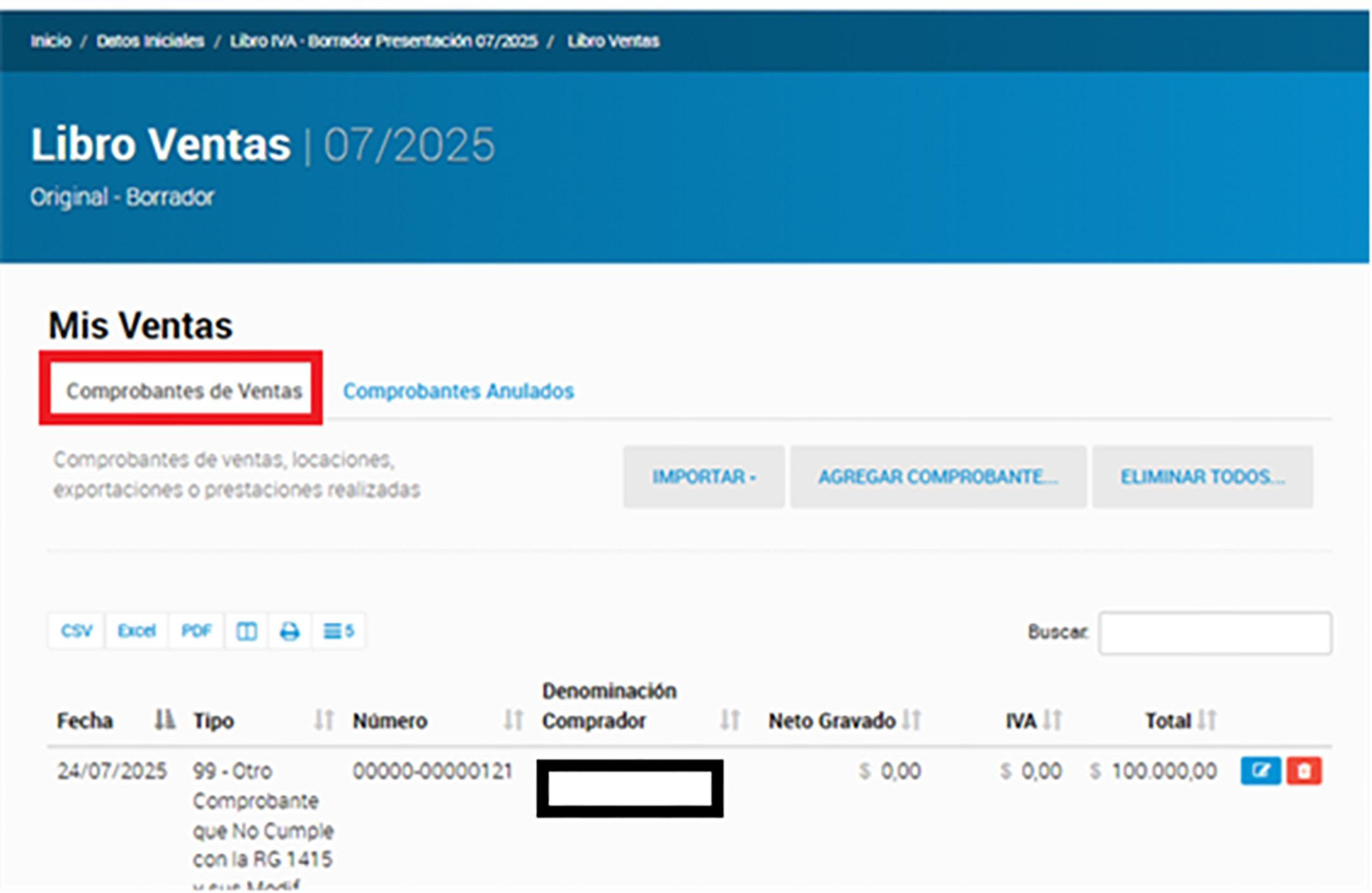 La registración de los comprobantes de ventas del período fiscal se lleva cabo mediante la siguiente pantalla: