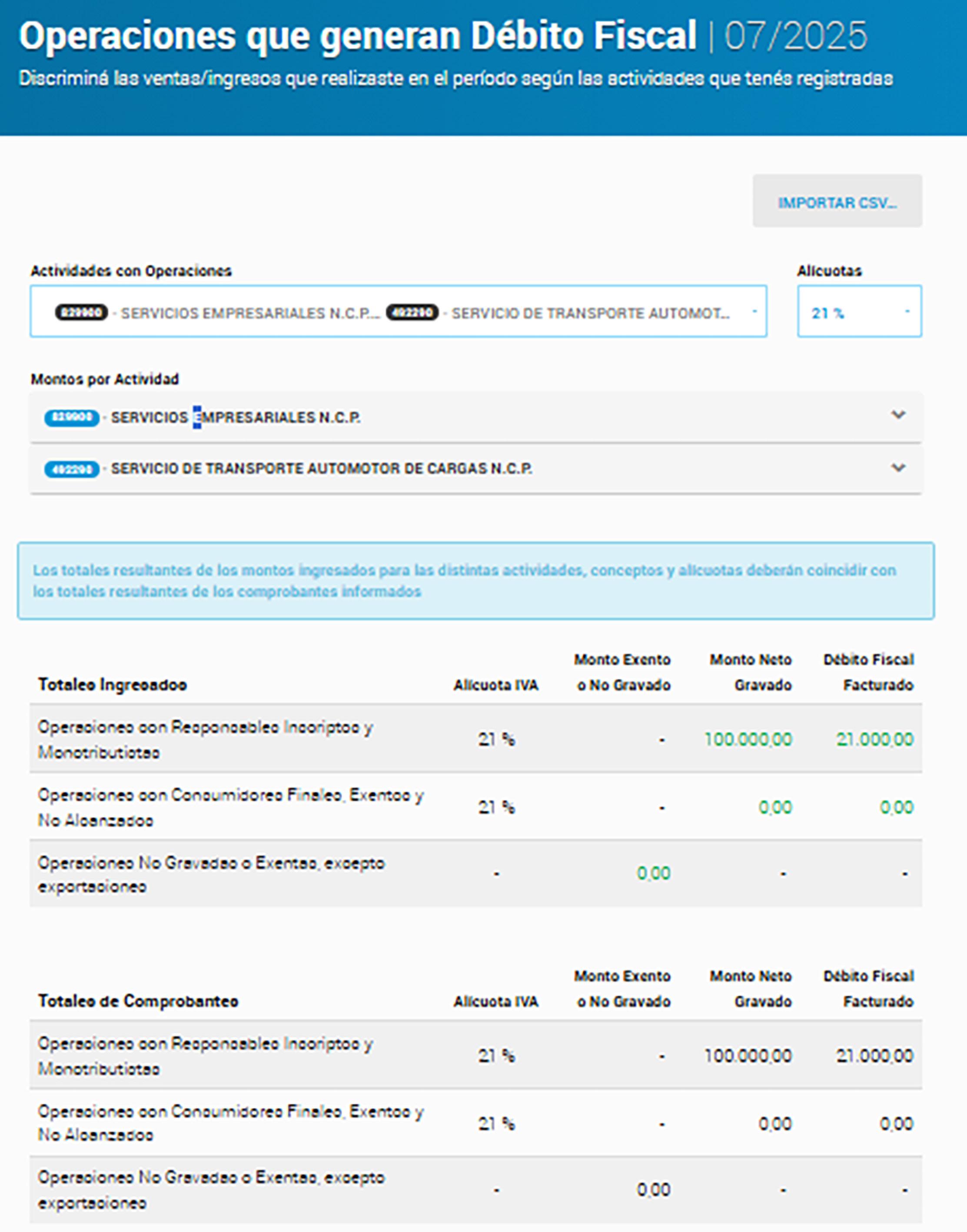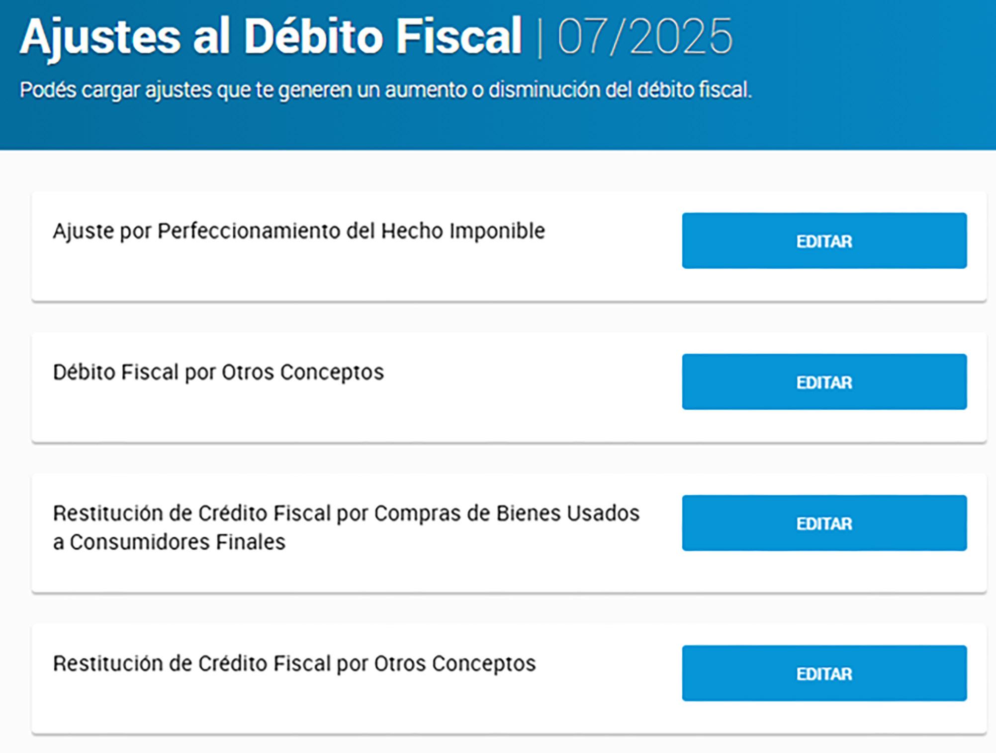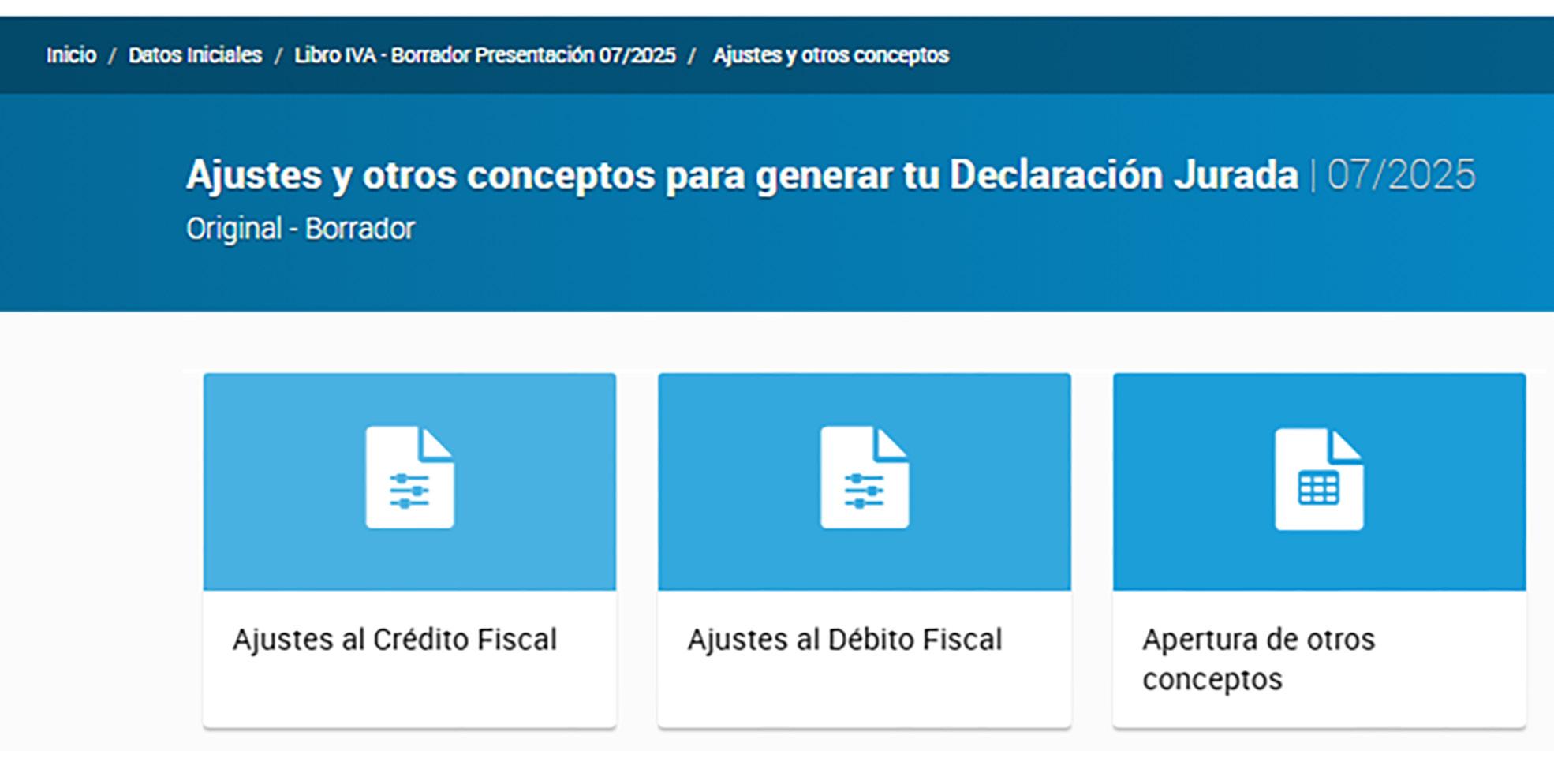 El débito fiscal de los comprobantes de las ventas surge del ítem “Libro IVA Ventas”. Asimismo, en la opción “Ajustes al débito fiscal” se cargan ajustes que incrementan o disminuyen el débito fiscal, a fin de llegar al débito fiscal a exponer en la declaración jurada. Por ejemplo, en “Restitución del crédito fiscal por otros conceptos” se expone en devolución del crédito por bienes que luego se destinan a operaciones exentas.