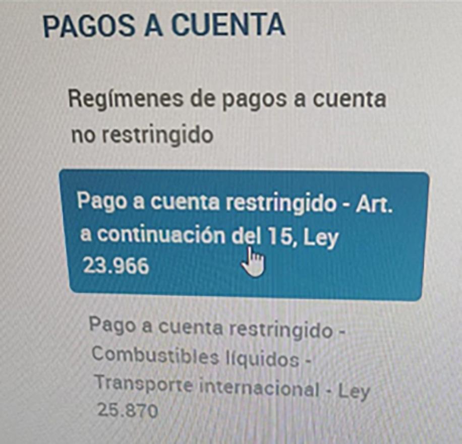 Como concepto general, la DJ se simplifica ofreciendo sólo las pantallas y/o datos a declarar necesarios en función del perfil del contribuyente En este caso específico, en Datos Iniciales debe seleccionar bajo el titulo Saldos a Favor y Pagos a cuenta la opción Otros pagos a cuenta además de retenciones y percepciones, así se habilita en la tarjeta Pagos a Cuenta bajo el titulo Pago a cuenta Restringido- Art. a continuación del 15, Ley 23966. Para ello debe tener una actividad económica relacionada.