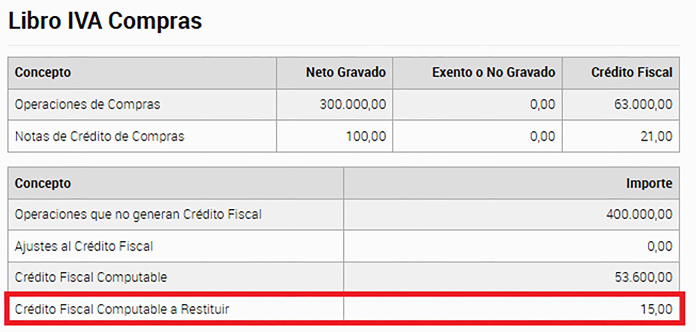 En el caso de poseer ventas gravadas y exentas, y corresponder la imputación del crédito fiscal ya sea en forma directa o por prorrateo, no se da la opción de detallar las notas de crédito, y no deja prorratear la restitución. Esto motiva que se genere un débito fiscal inexistente (equivalente a las restituciones de créditos fiscales no prorrateables), que se debe ajustar.