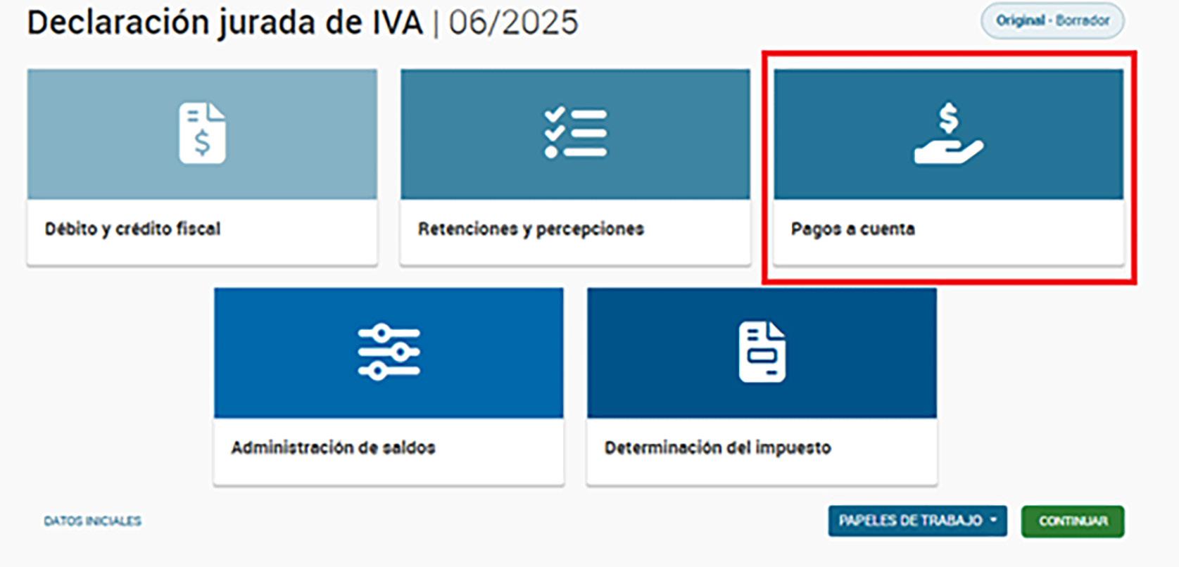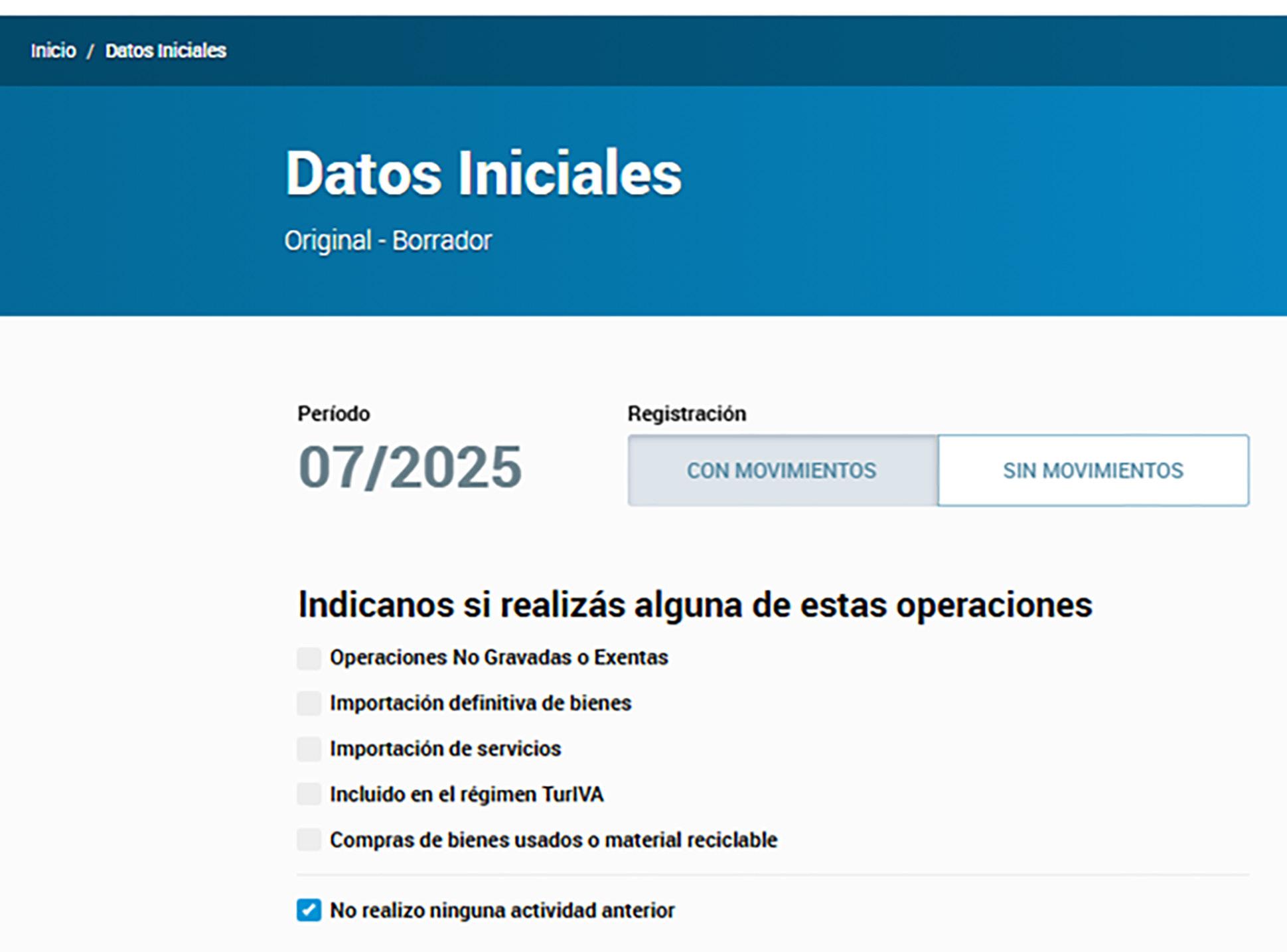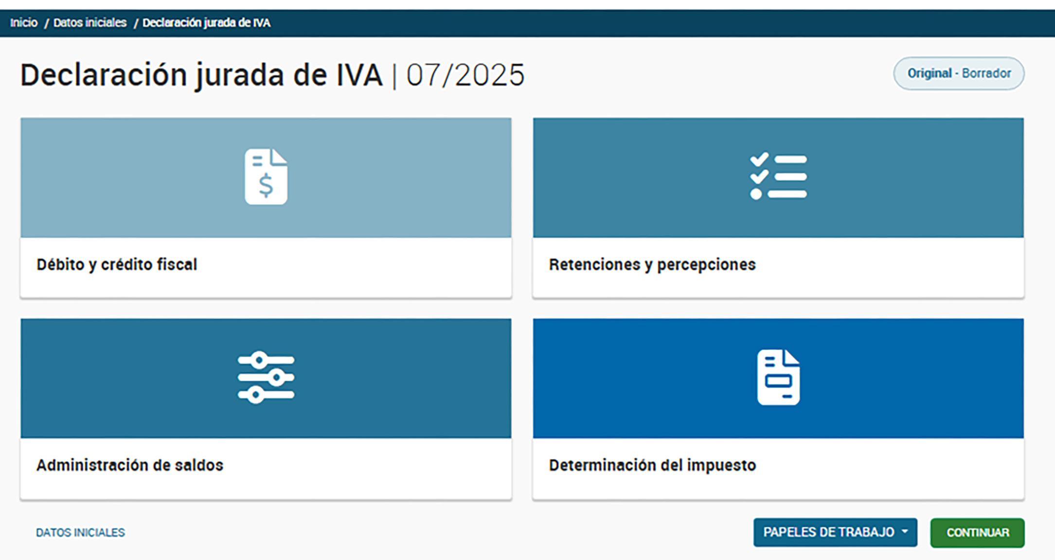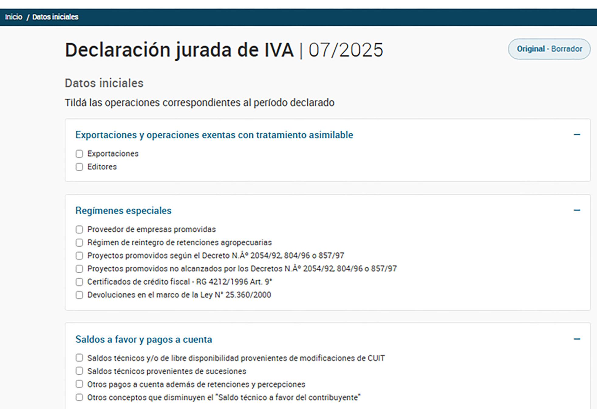 Es importante destacar que la siguiente pantalla permite personalizar la declaración jurada del impuesto al valor agregado (IVA) según las características del contribuyente. Esto es lo que denominamos personalización manual. No obstante, existe una customización personal y automática que se da según la actividad declarada. Verbigracia: el pago a cuenta del IVA por impuesto sobre los combustibles líquidos y al dióxido de carbono (ITC) solo aparece cuando la actividad declarada está relacionada con el transporte.
