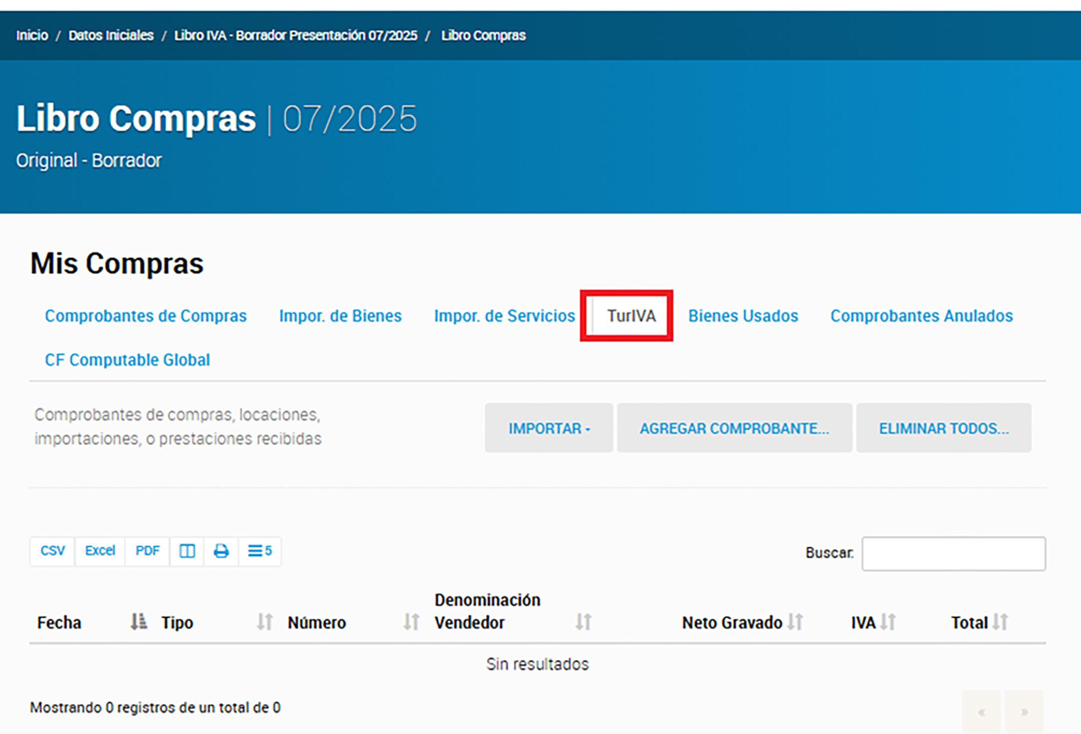 La opción se informa en el Módulo “Registración Electrónica de Operaciones”. Para ello se debe tildar la opción “Incluido en el Régimen TurIVA” en la pantalla de Datos Iniciales de cada período. Luego se visualizará una nueva pestaña denominada TurIVA, tanto en el Libro Ventas como en el Libro Compras con los datos específicos de carga para este tipo de