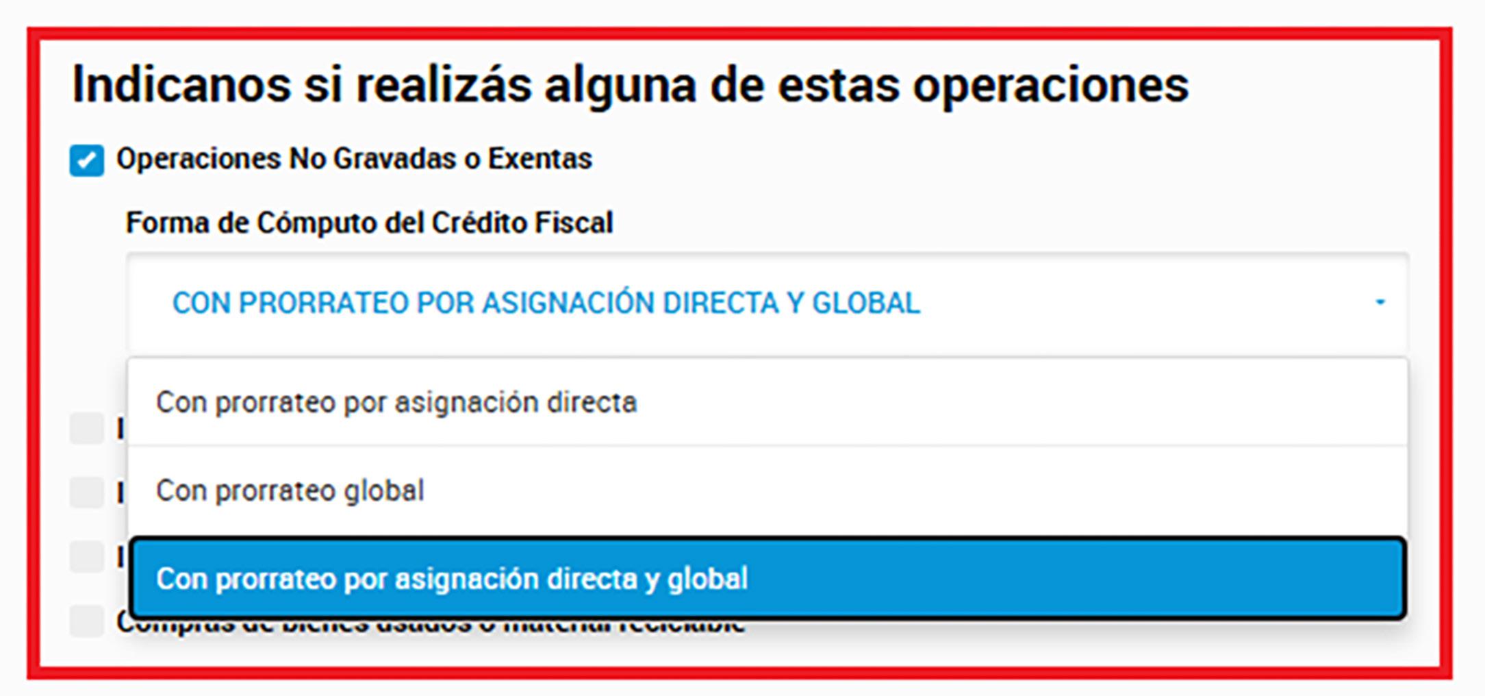Si se seleccionan alguno de los otros dos métodos de prorrateo, en la pantalla “CF Computable Global” deben ingresar los montos totales de crédito fiscal computable con asignación directa, crédito fiscal computable determinado por prorrateo, crédito fiscal no computable Global y Crédito Fiscal Computable a Restituir. Por favor, en caso que el sistema no esté realizando los cálculos correctamente, enviarnos print de pantalla con los errores detectados y datos del contribuyente así podemos verificar el funcionamiento del sistema.
