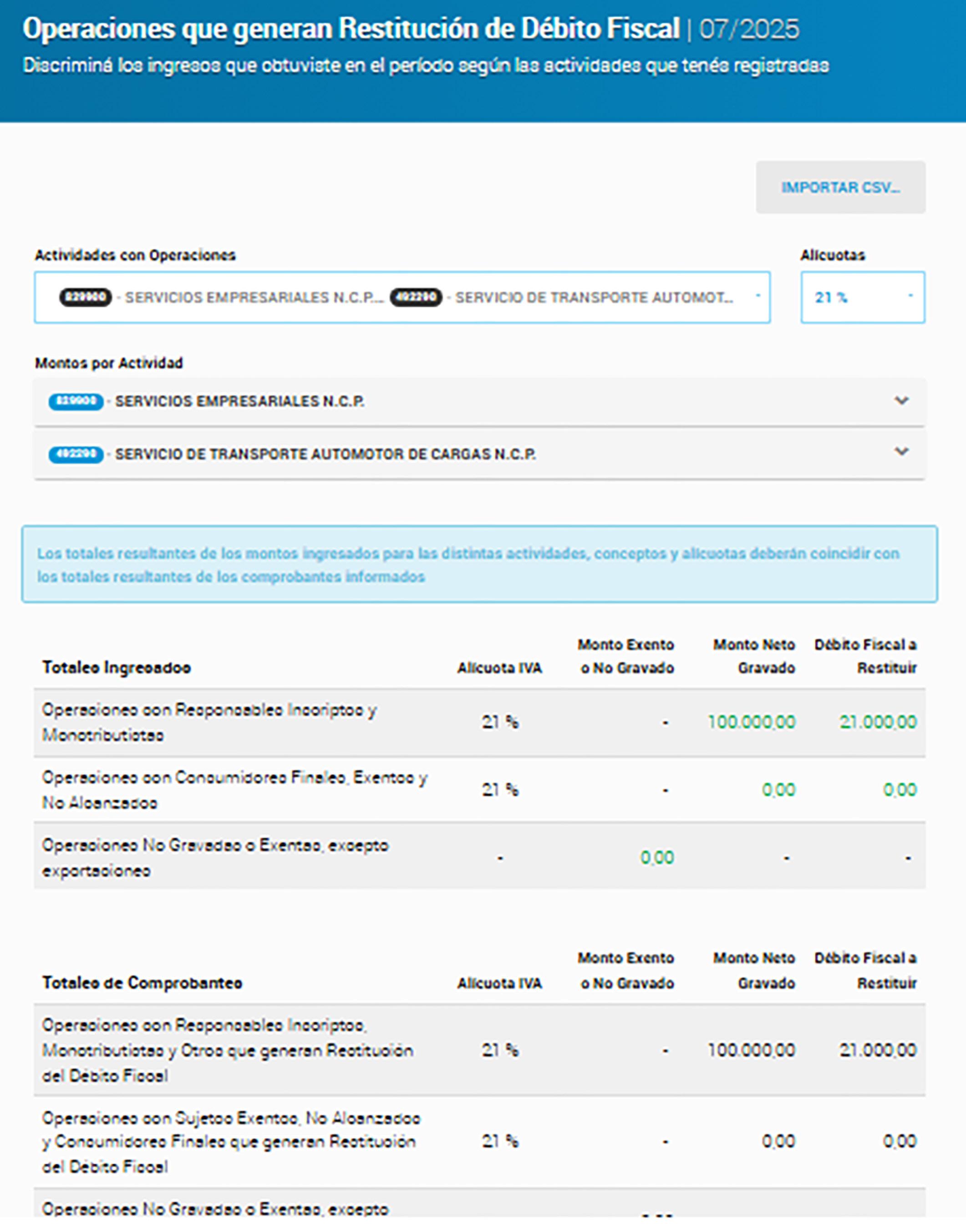 - Apertura por actividad, por tipo de sujeto y alícuota de operaciones de ventas que generan débito fiscal y restitución de débito fiscal.