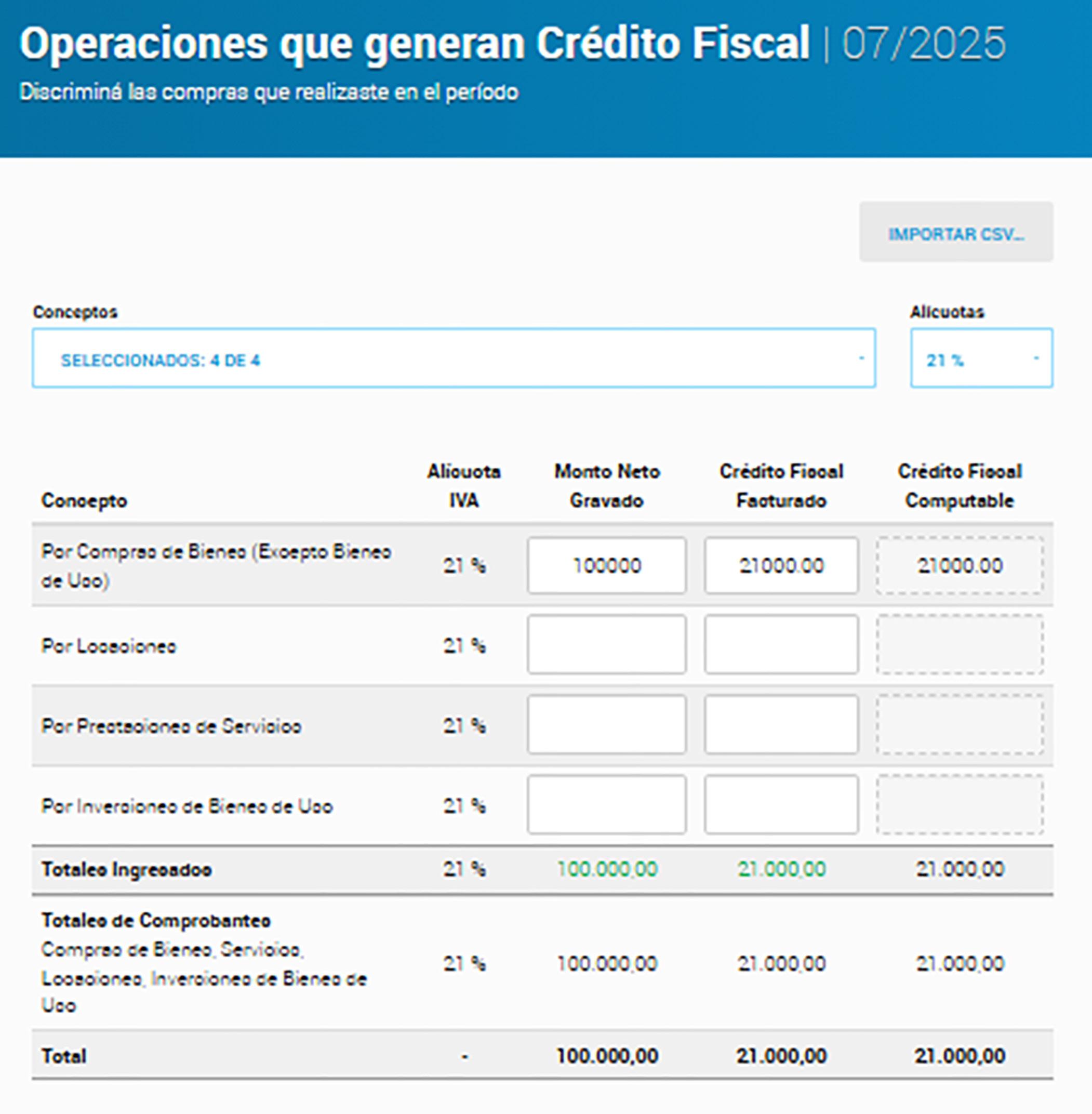 El crédito fiscal de los comprobantes de las compras e importaciones, conciliado con el respectivo prorrateo, surge del ítem “Libro IVA Compras”. Asimismo, en la opción “Ajustes al crédito fiscal” se cargan todas aquellas otras operaciones que generan o incrementan el crédito fiscal, pero que no surgen de operaciones con proveedores, tales como el crédito fiscal por contribuciones patronales.
