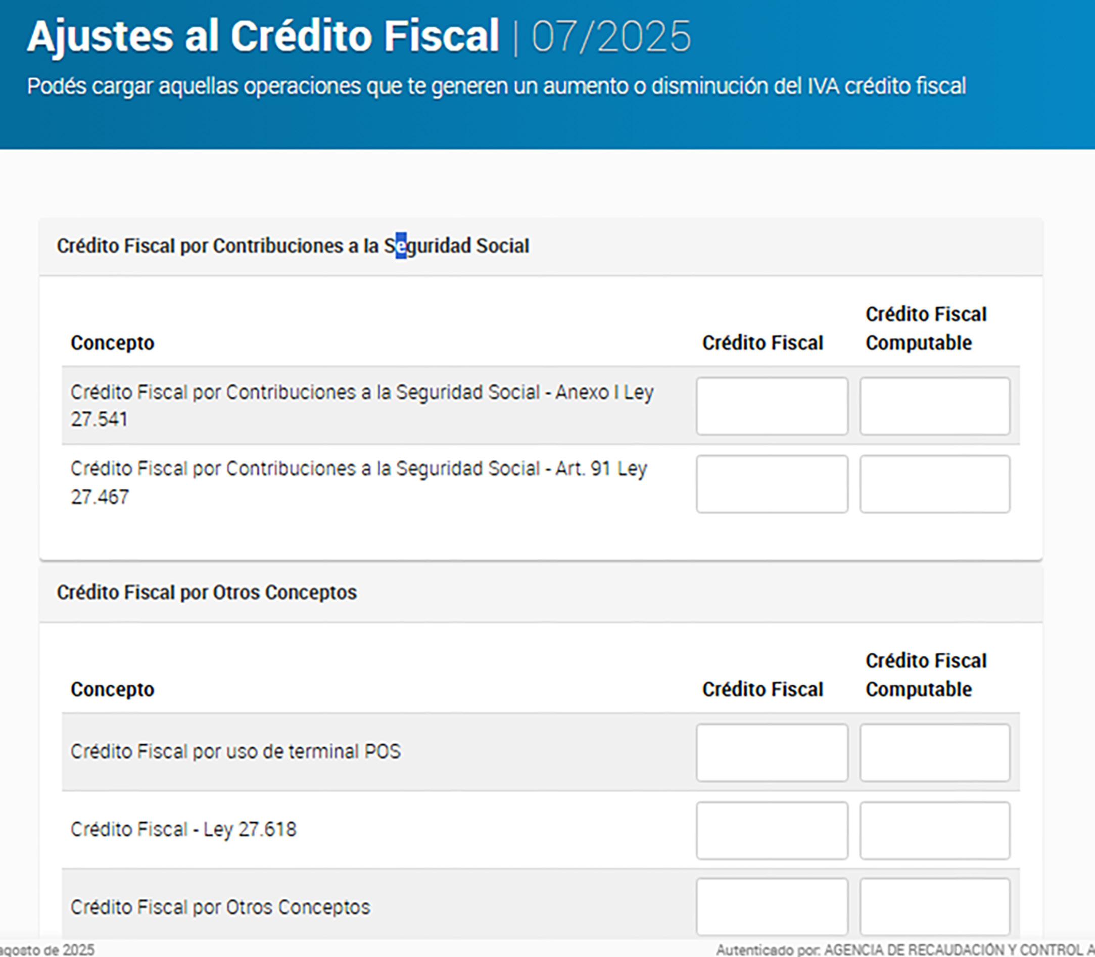 a favor de ARCA. El ajuste del crédito fiscal se debe informar en el último período fiscal del contribuyente. Para las personas humanas seria en el mes de diciembre y persona jurídica según el cierre de ejercicio.