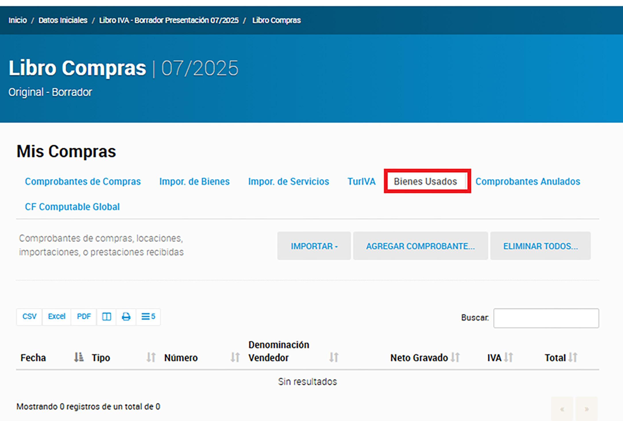 La exportación de archivo en formato csv se encuentra disponible en el servicio con clave fiscal ‘Mis Comprobantes’.