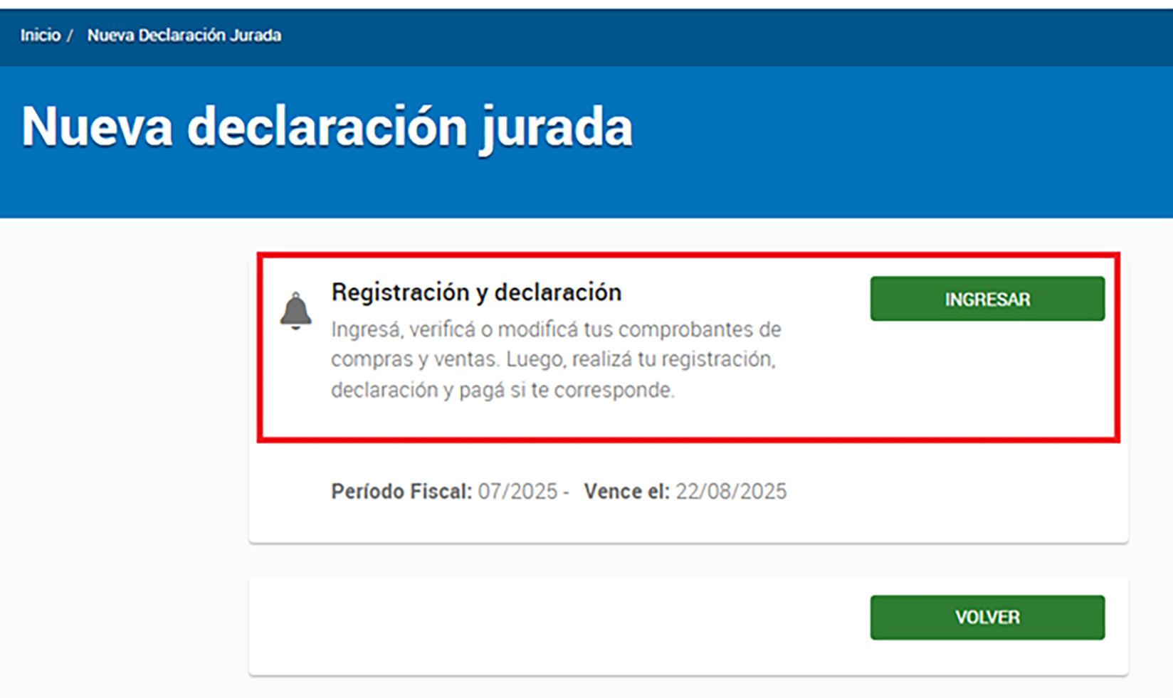 Se debe ingresar a la opción “Nueva declaración jurada” seleccionando el período fiscal.