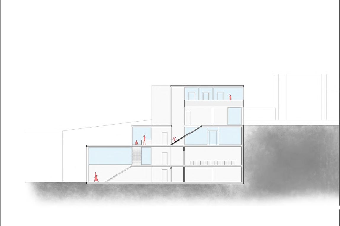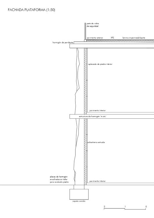 Based on the extraction of stone from the travertine quarries of Teruel, a stepped scheme is followed. More material is extracted as the elevation increases, thus reducing the footprint on the lower levels.