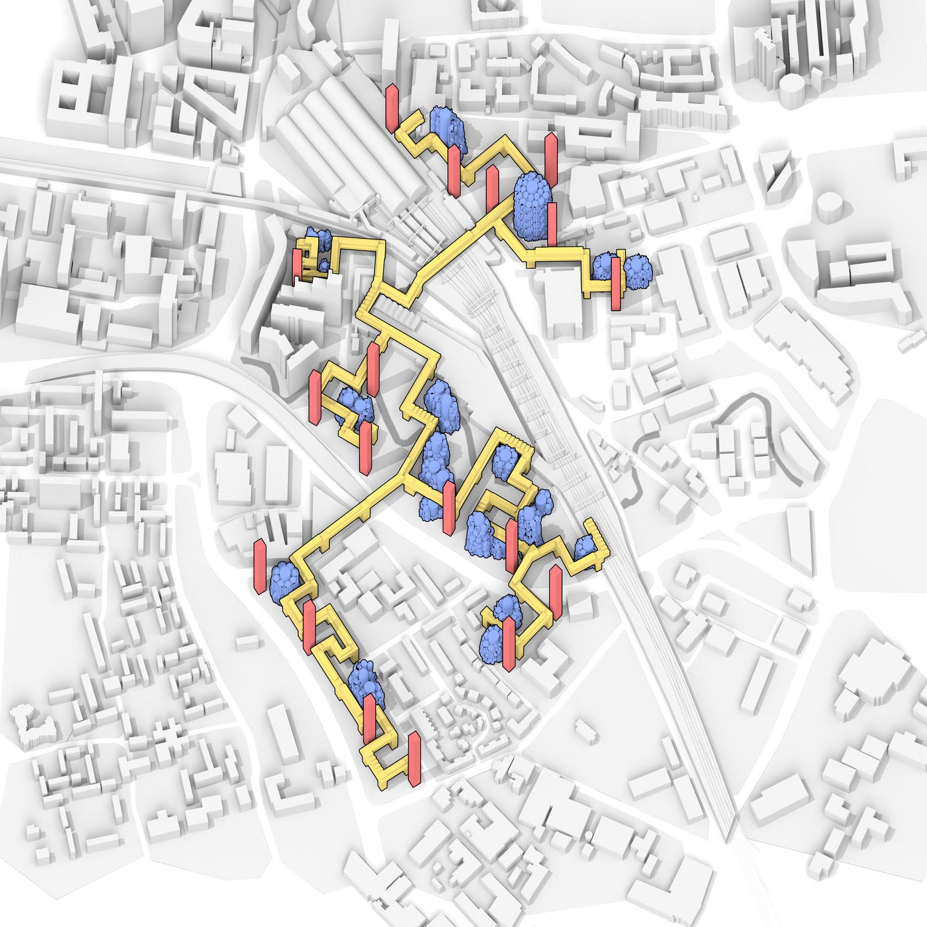 Through banners and signage, the streets become circulation spaces, while buildings and points of interest serve as exhibition halls within the pavilion.