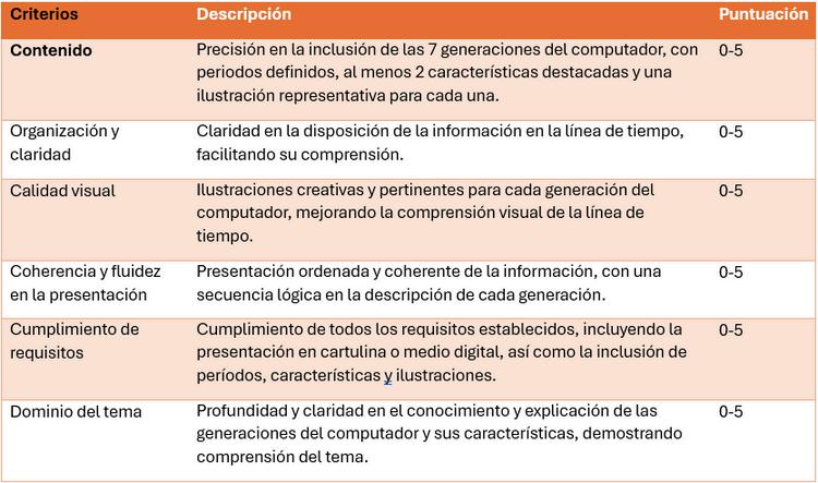Indicaciones: Individual o grupal, debe investigar y exponer en una cartulina o medio digital (diapositivas), una línea de tiempo que contenga las 7 generaciones del computador. Debe contener el periodo (Tiempo) de la generación, al menos 2 características de esa generación y una ilustración de esta.