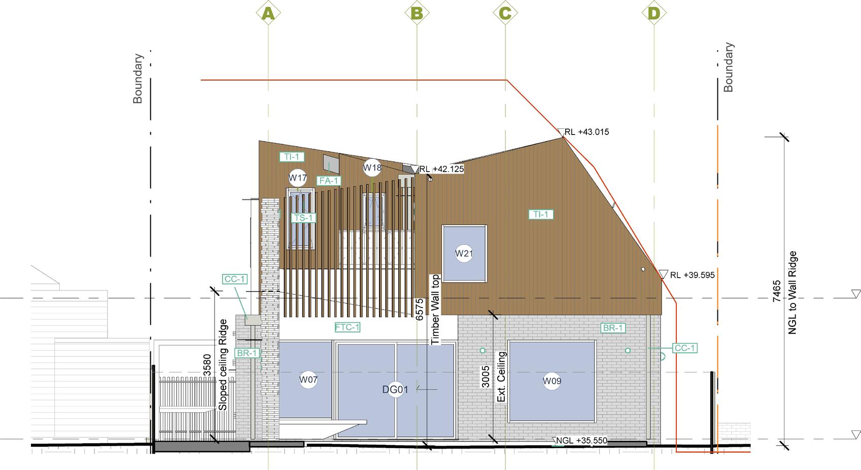 Ceiling Height 2700 Ceiling Height 3355 Ceiling Height 2330 Ceiling Height 2600 RL +33.145 RL +32.280 RL +31.795 Existing GFL +29.760 Existing Top Ridge +36.600 A B New Ground Floor +28.600 First Floor +31.882 Boundary Boundary C W10 W19 W21 W25 NGL +28.390 NGL +28.520 1 D01 CC-1 WB-1 R-1 RME1 PB1 D Ceiling Height 1955 Ceiling Height 3340 Construction Documentation Section 6 Construction Documentation Section 5