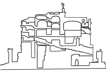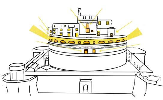 There are definite hierarchy in the massing of the entire structure of the Castel Sant’ Angelo. The light grey represents smaller structures such as the fortress and smaller column structures. The darkest grey represents the focal point of the entire structure, which is the center and heart of the castle.