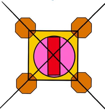 When divided by two perpendicular axis, all four quadrants of the building’s structure are symmetrical and balanced to each other. Each segment contains a corner of the fortress wall, one polygonal structure, and a quarter of the main rounded structure in the center.