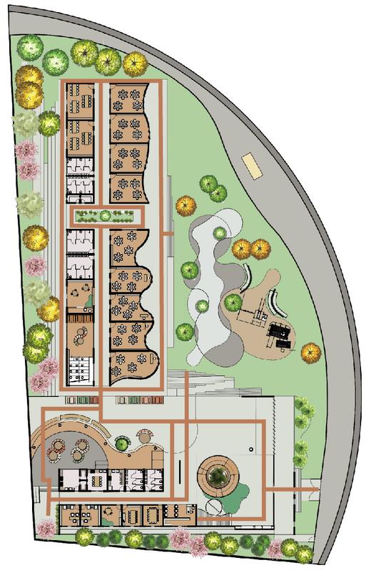 o pro jeto. setorizaçãoevolumetria. bloco de salas de aula bloco de serviços bloco administrativo circulação, pátio interno e refeitório bloco ed. física e solário