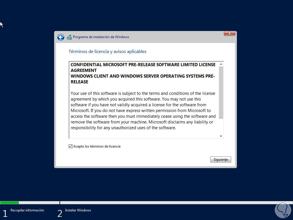 Pulsamos en Siguiente y sera desplegada esta ventana. Allí podemos notar que el titulo aun no indica la versión de Windows Server usada, recordemos que en 2016 se indica Windows Server 2016.