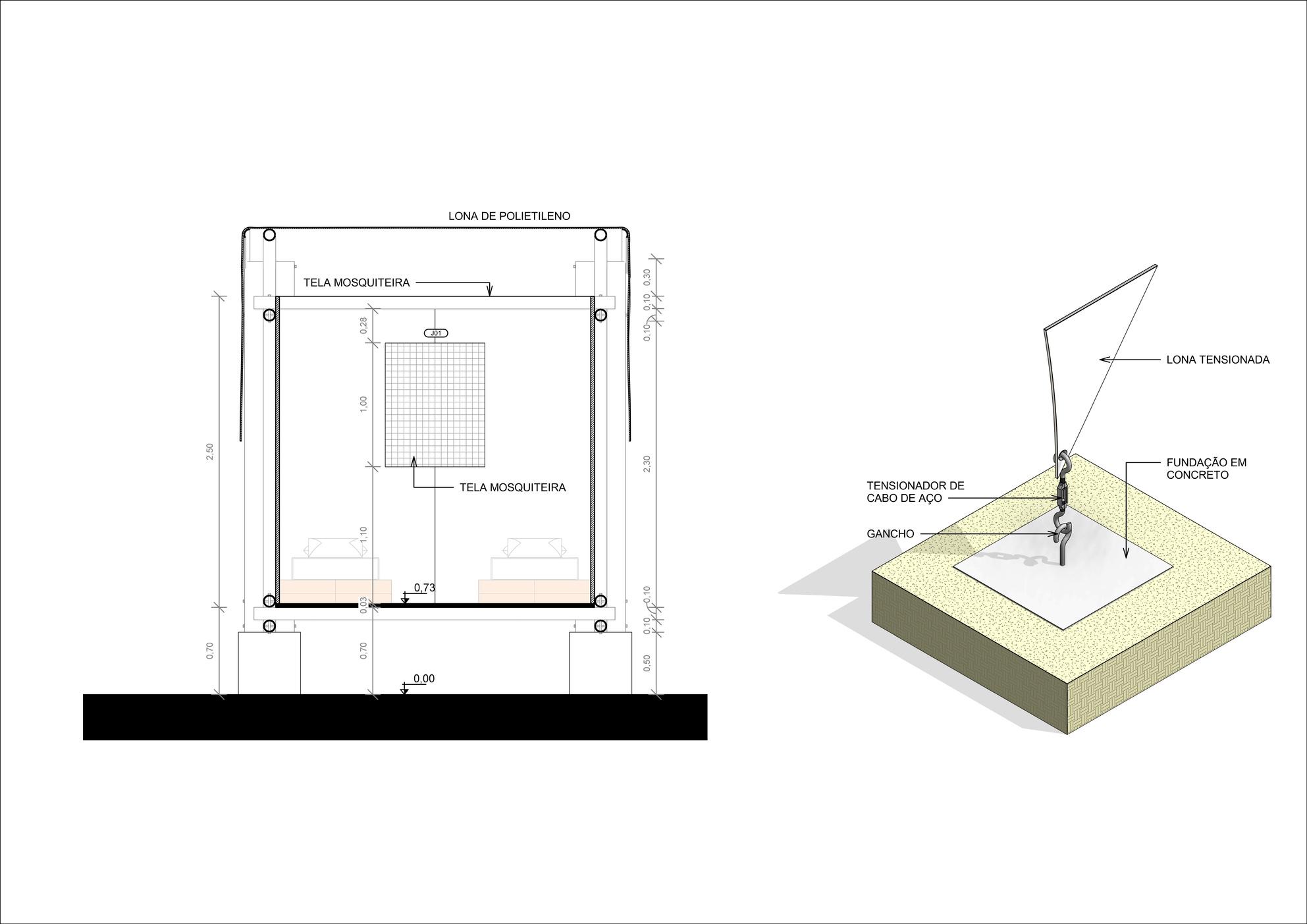 O projeto é construído a partir de um módulo base de 12,5m² (2,50x5,00m), equivalente a uma unidade habitacional com capacidade para dois leitos De acordo com a demanda, dormitórios maiores podem ser formados a partir da união desses módulos, e as demais edificações de apoio (refeitório com cozinha, sanitários, lavanderia) também derivam desta modulação.