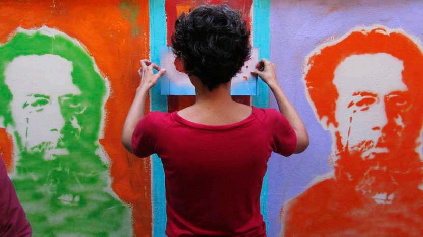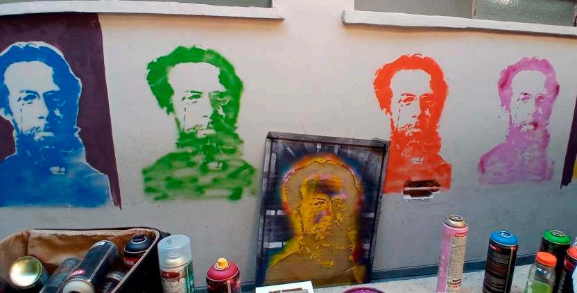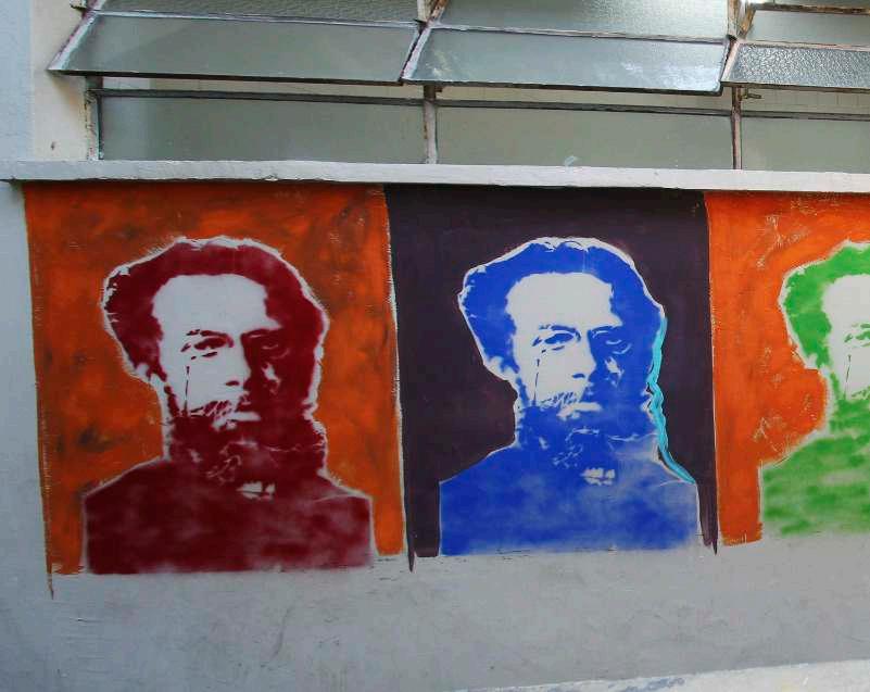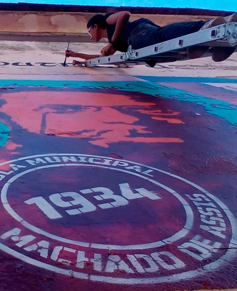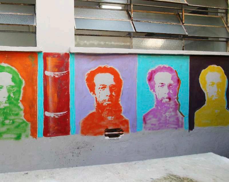 Machadoérevistonomuralcomoumartistaurbanocontemporâneo,pensadordonossotempoecronista dacidade.Emseustextos,colecionouadágios,ditadospopulares,expressõesproverbiais,aforismosese deixouatravessarpelasdiversaspaisagenseruasdoRio.Agorasuafiguraicônicasematerializamatizada no muro da Escola Municipal Machado deAssis, fundada em 1934 no bairro de Santa Teresa.Arelação entre a experimentação formal do escritor e a arte urbana do grafite e do estêncil faz do mural um dispositivodevisibilidade,quecontribuiparaqueoespaçopúblicosetransformeemumgrandeacervode arte,convocandoopúblicoaacessarasobrasliteráriasevisuaisatravésdeumnovoolhar.