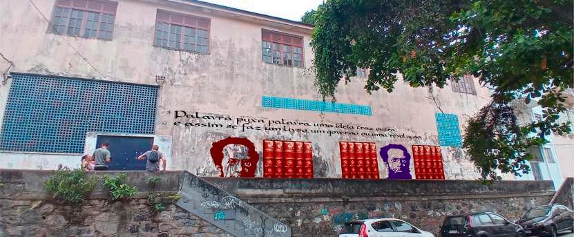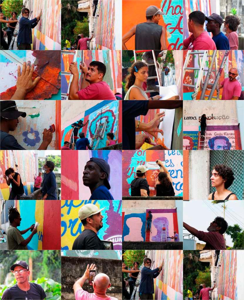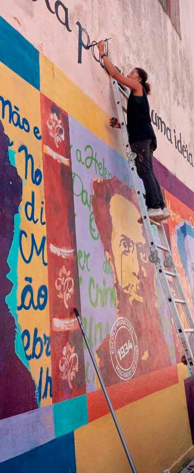“Palavrapuxapalavra,umaideiatrazoutra,eassimsefazumlivro,umgoverno,ouumarevolução”,dizo narrador do conto “Primas de Sapucaia!”, de 1883, citação transcrita no painel. As palavras do escritor criaramumuniversoimagéticoqueaindatraduzaoleitoro“sentimentoíntimo”dacoletividadeemtornode umaideiadenação.Apossibilidadedeobservararealidadeatravésdeintervençõesartísticastransformao lugareosentidohabitualdascoisas,renovandosignificadosnapartilhadesensibilidadesinscritasemuma comunidadedadiferença,comoéacomunidadeescolarquerecebeomural.Dessamaneira,asrelações entresujeitoemanifestaçõesculturais,abertasaumamútuafecundação,promoveoutrosmodosdevero visível,reaprendendoapensarvendoeaverpensandoaopassarpeloMuralMachadiano.