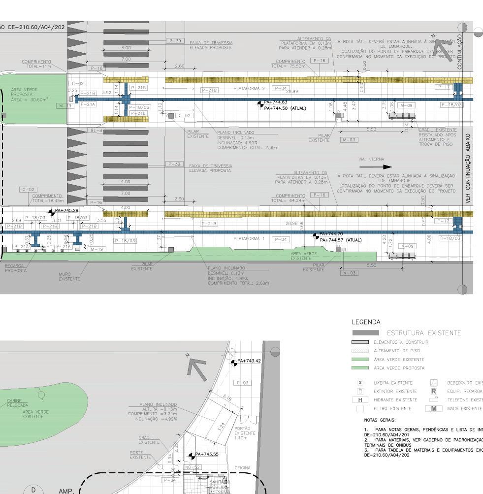 Foram 34 terminais de ônibus na cidade de São Paulo, cujos projetos foram avaliados para reforma e adequação de acessíbilidade seguindo as normas da SPTrans. Levando em consideração as necessidades de cada um deles foram propostas reconfigurações e ampliações para otimizar suas dinâminas de funcionamento, buscando uma coerência que permeie os terminais.