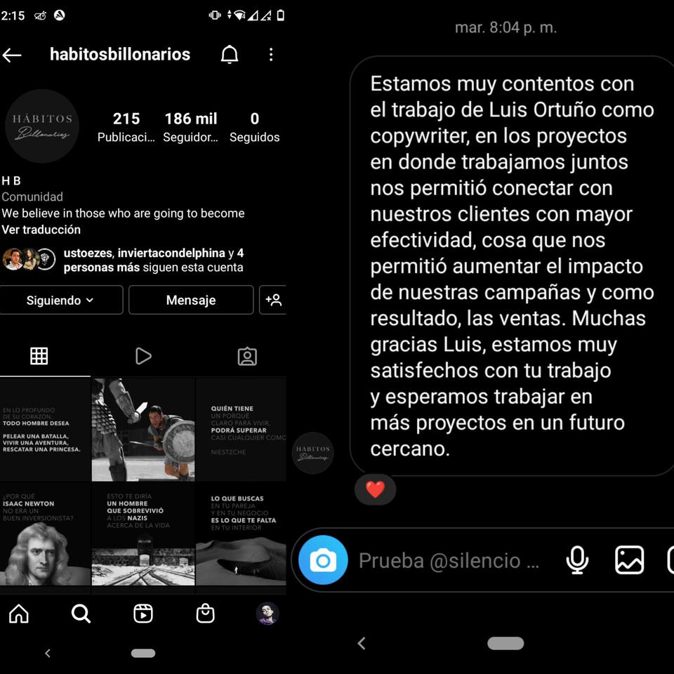 Trabaje en el equipo de @HabitosBillonarios como Copywriter y Content Manager, donde estuve encargado de desarrollar planes de contenido y crear mensajes para conectar con su audiencia. Entre lo más destacado, redacte copys para su landing page, razón por la cual aumentó su venta de ebooks y asesorías de marketing digital.