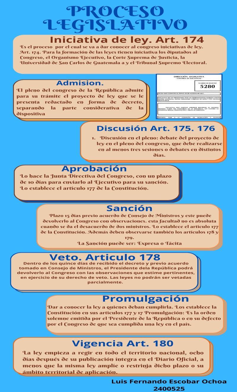 En Guatemala, el proceso o procedimiento legislativo tiene su base legal en los artículos del 174 al 181 de la Constitución Política de la República y la Ley Orgánica del Organismo