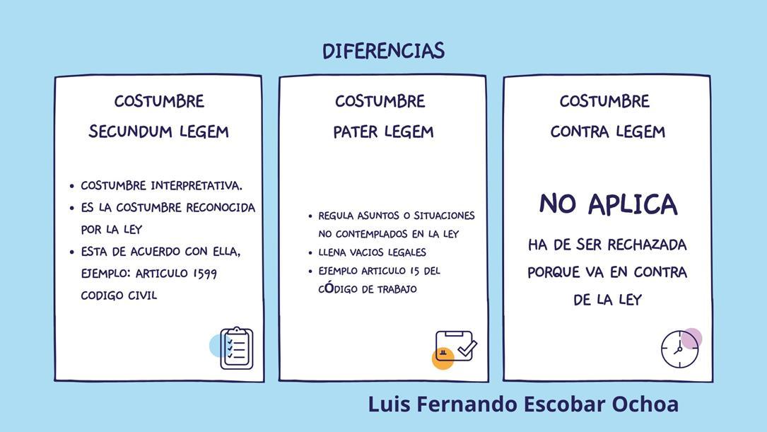 Esta costumbre llena vacíos legales, surge por la ausencia de una ley, no se reconoce en las normas. Ejemplo: código de trabajo, decreto 1441. Artículo 15 “Los casos no previstos por este Código, porsus reglamentos o por las demás leyesrelativas al trabajo, se deben resolver, en primer término, de acuerdo con los principios del derecho de Trabajo; en segundo lugar, de acuerdo con la equidad, la costumbre o el uso locales, en armonía con dichos principios; y, por último, de acuerdo con los principios y leyes de Derecho Común