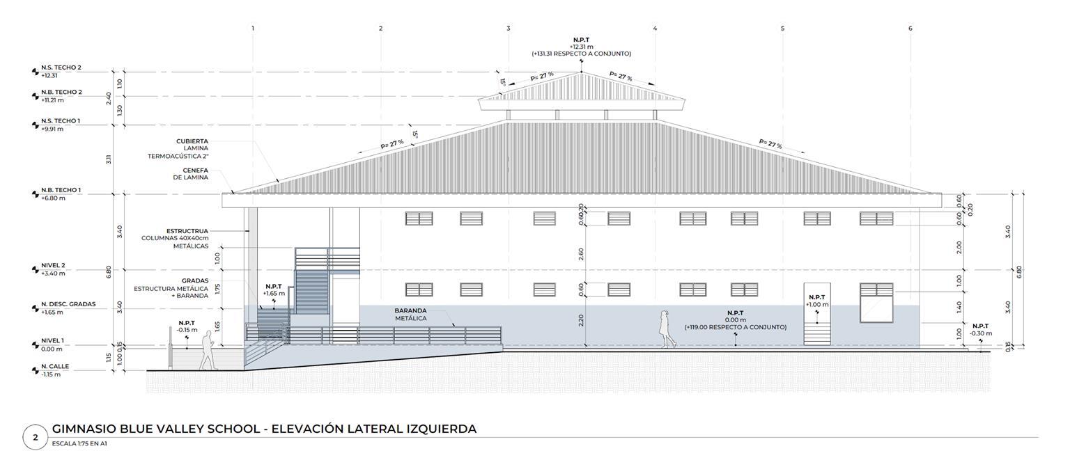 Ejes, cotas de nivel, materiales rotulados, líneas ocultas, siluetas humanas a 40% de opacidad para escala.