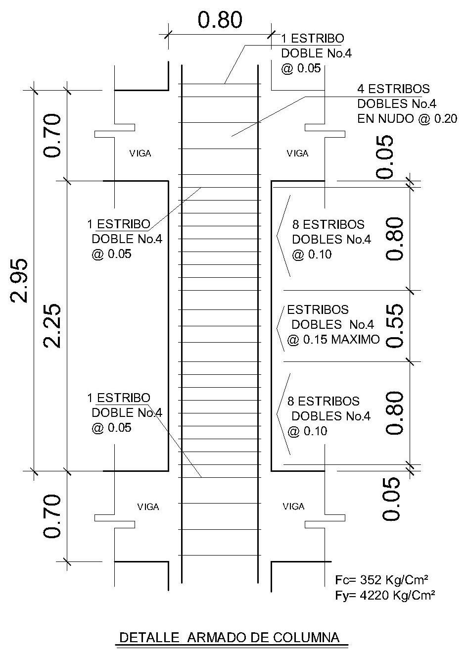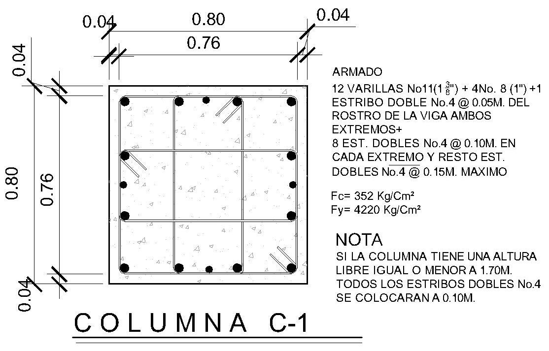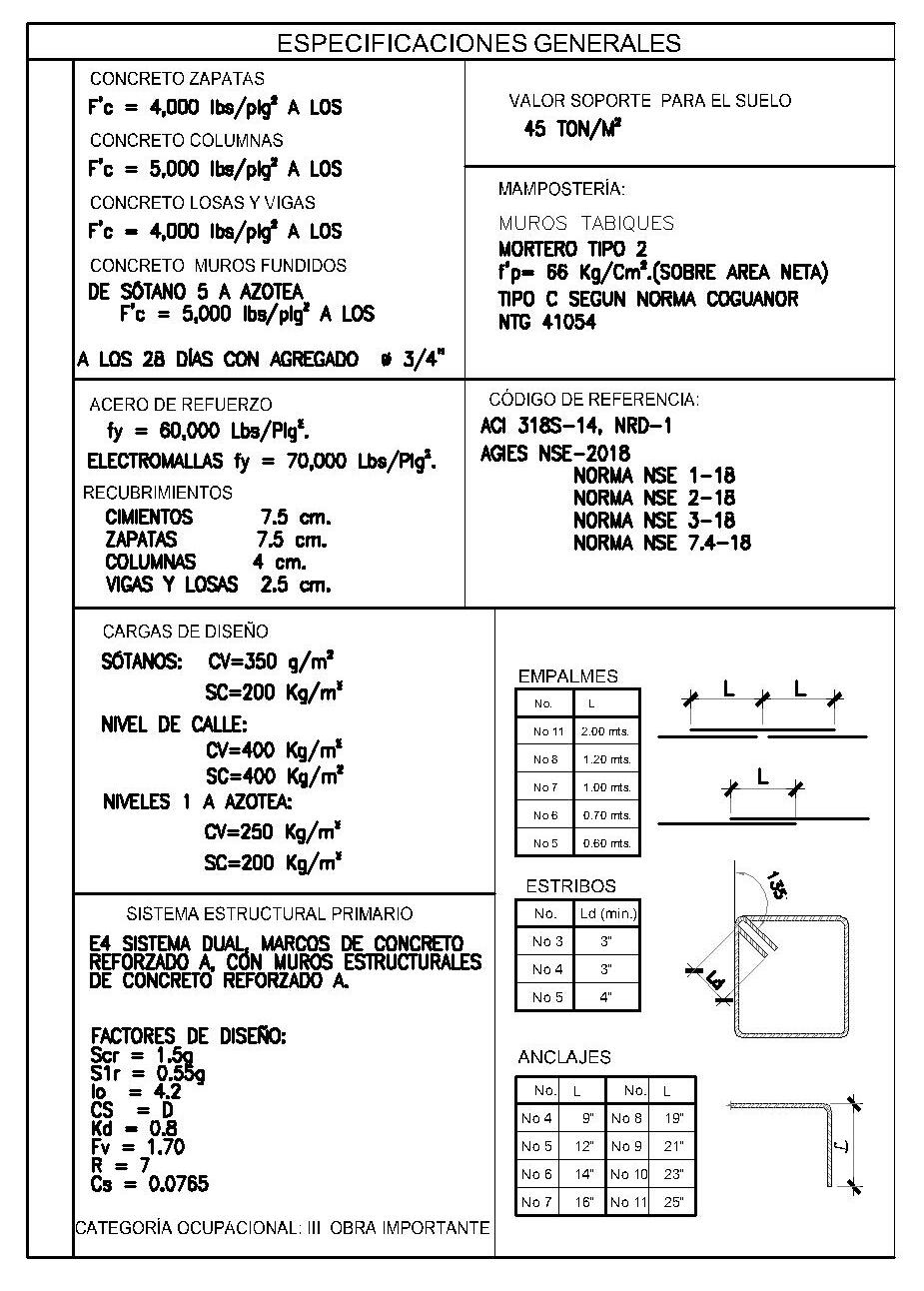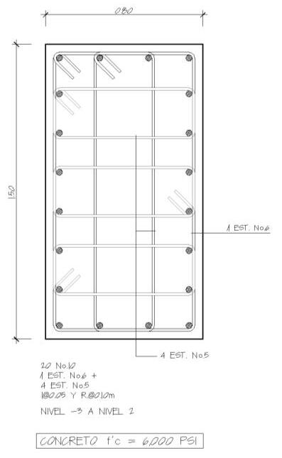 Las columnas y muros se han especificado con concretos con f'c= 560 kg/cm², f'c= 490 kg/cm², f'c= 420 kg/cm², f'c= 385 kg/cm², f'c= 350 kg/cm² y f'c= 280 kg/cm² esas resistencias han permitido reducir la cuantía de acero en elementos de soporte Es extremadamente importante que si se logren las resistencias especificadas a los 28 días o lo indicado en el plano.