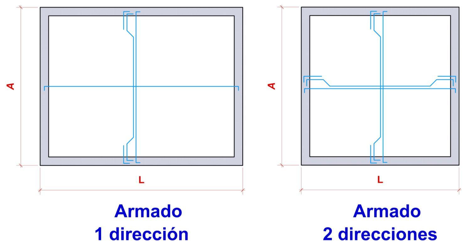 > L=3.75 m. y A=1.50 m. 3.75/1.50 = 2.5 >> armado 1 dirección > L=3.75 m. y A=2.25 m. 3.75/2.25 = 1.67 >> armado 2 direcciones