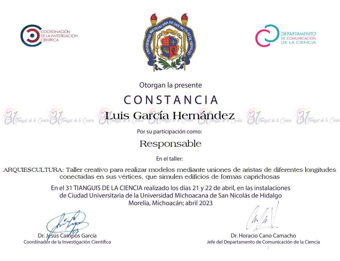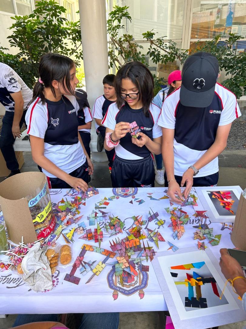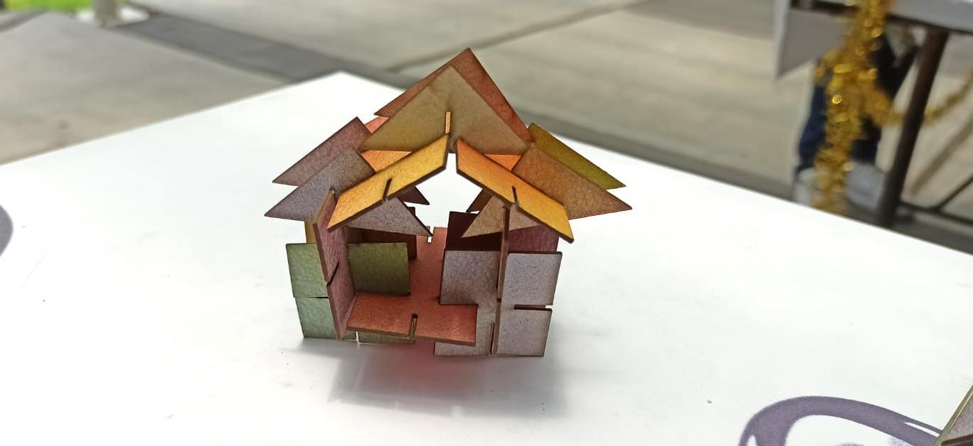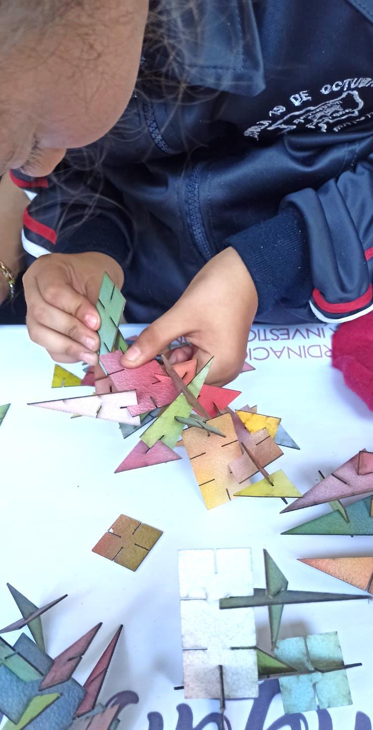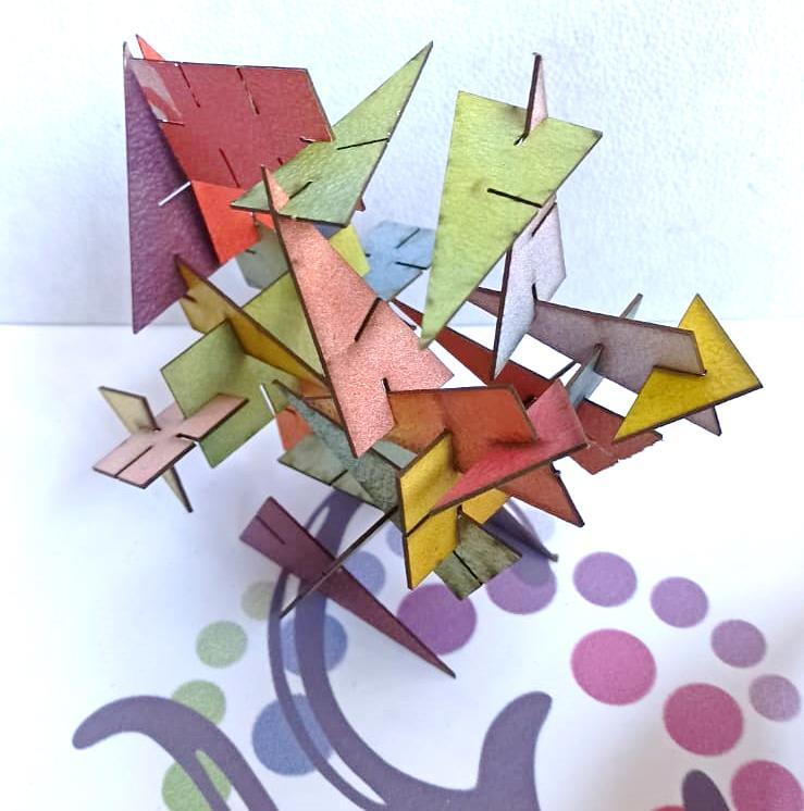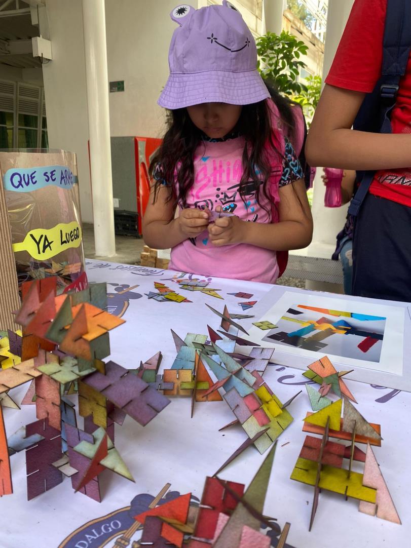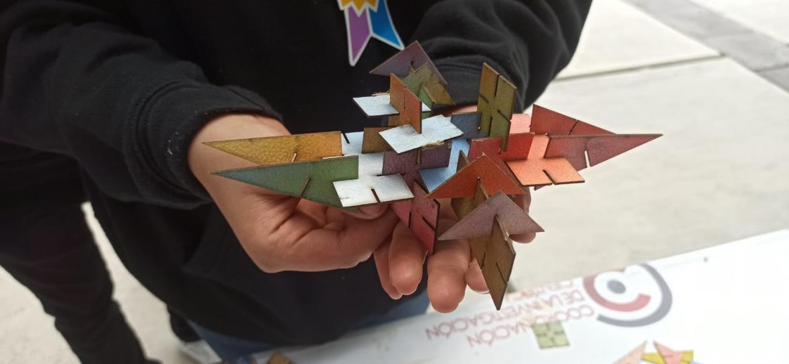 Este taller fue desarrollado para impartirse como parte del XXXI Tianguis de la Ciencia de la UMSNH. Para este se diseñaron cuatro diferentes módulos bidimensionales con formas geométricas básicas (triangulo, rectángulo y cuadrado), con varios cortes que les permiten ensamblarse unos con otros. Estos módulos fueron diseñados en AutoCAD y cortados a laser sobre papel cascarón, y finalmente fueron pintados de diversos colores primarios, y combinaciones de estos, con aerosol.