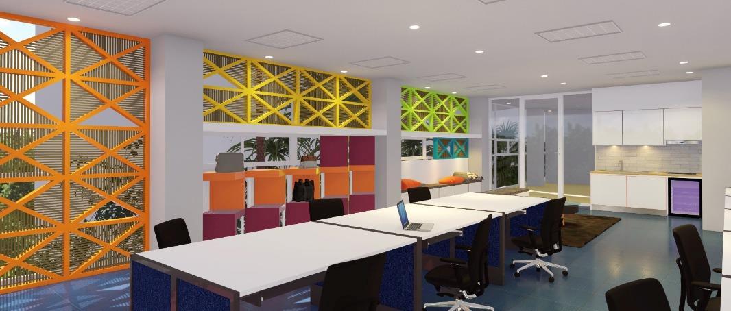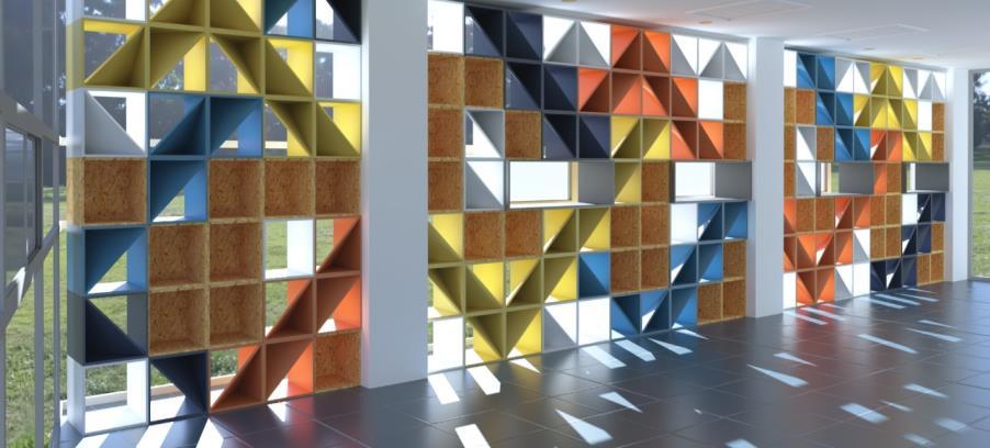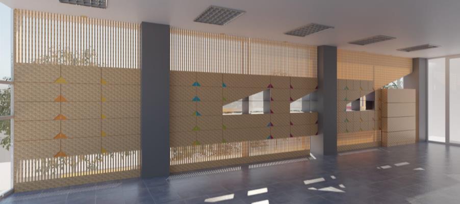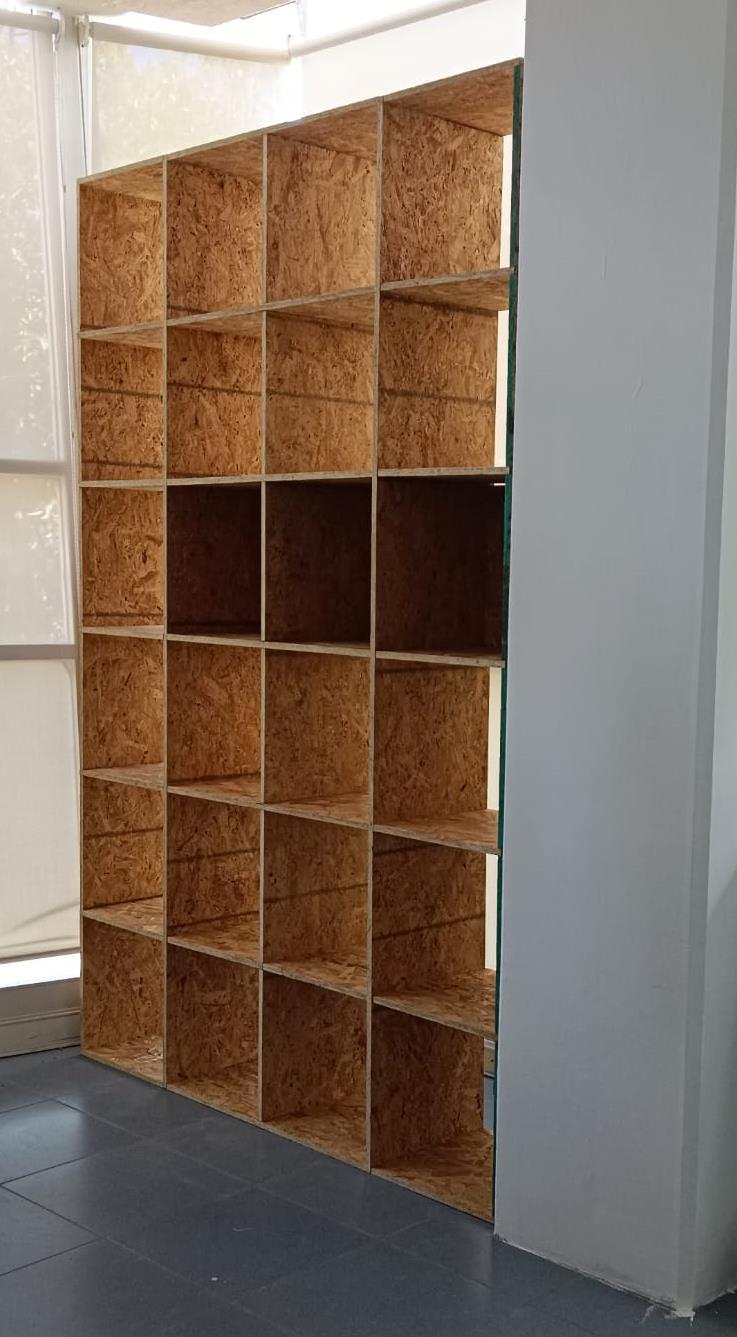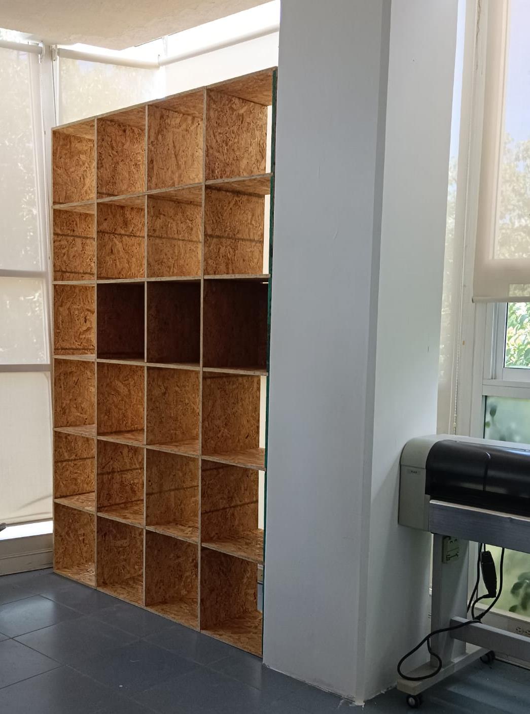 Se construyó un muro de OSB dentro de un aula de uso común del posgrado de Arquitectura, que funciona como celosía, parasol y estantería, para crear un espacio confortable donde pueda trabajar la comunidad. Su diseño permite que se le utilice como guardarropa, pudiendo colocar en este mochilas, computadoras portátiles y otros materiales de trabajo de quienes usen el espacio.