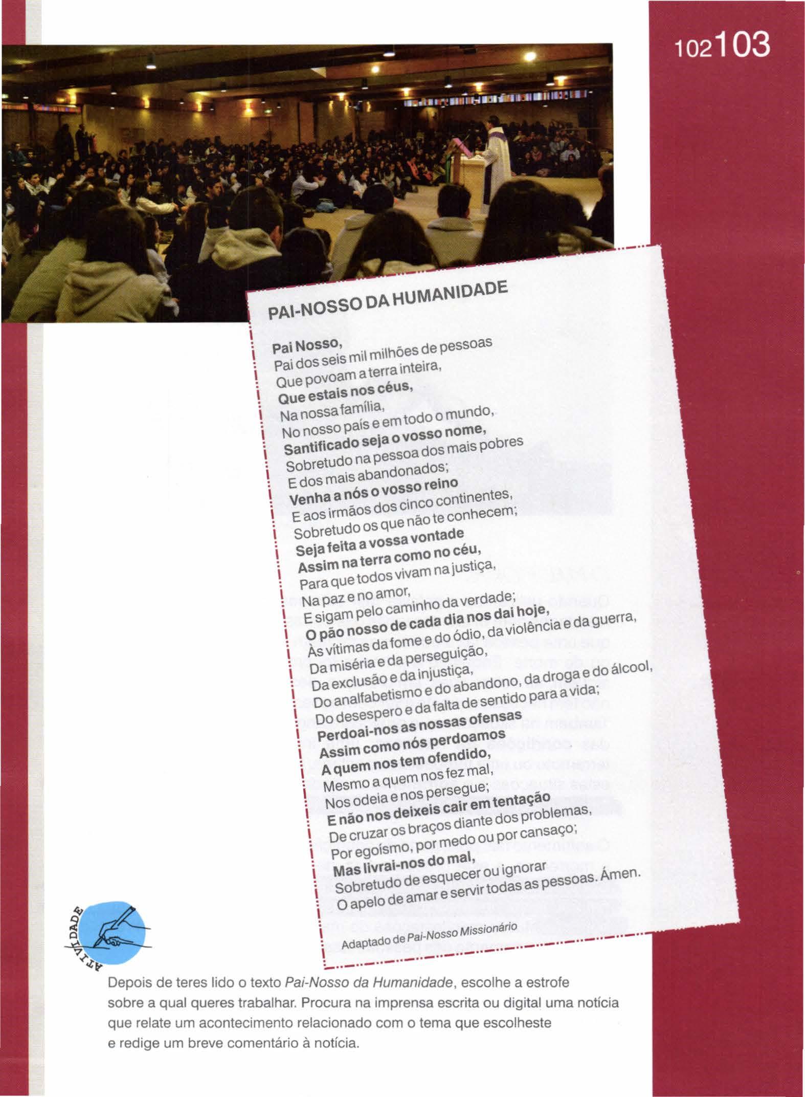 Esta tarefa, realizada sob a superior orientação da Conferência Episcopal Portuguesa, a responsabilidade da Cotnissão Episcopal da Educação Cristã e Doutrina da Fé e a dedicação pennanente do Secretariado Nacional da Educação Cristã, envolveu uma extensa e motivada equipa de trabalho. Queremos, pois, agradecer aos autores dos textos e aos artistas que elaboraram a montagem dos mesmos, pelo seu entusiasmo permanente e pela qualidade do resultado final. Também referimos, com apreço e gratidão, os docentes que experimcntaran1 e comentara1n os 1nanuais, ainda durante a sua execução, e o contributo insubstituível dos Secretariados Diocesanos responsáveis pela disciplina na Igreja local. E a todos os docentes de Educação Moral e Religiosa Católica, não só entregamos estes indispensáveis instrumentos pedagógicos corno aproveitatnos esta feliz ocasião para sublinhar a relevância do seu fundamental papel, nas escolas e na formação das suas alunas e dos seus alunos, e testemunhamos o nosso reconhecimento pelo seu extenso compromisso pastoral na sociedade portuguesa.