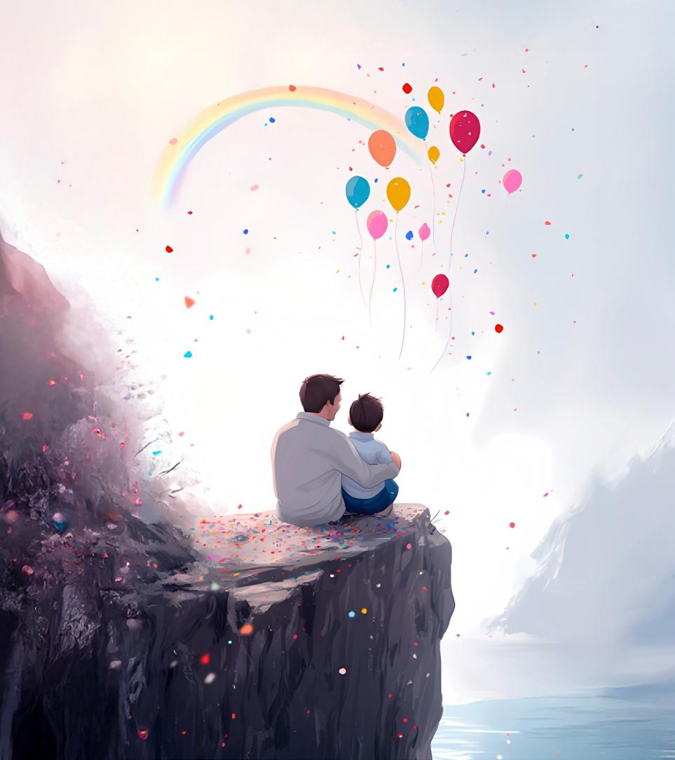 The sky above them is bright, with a vibrant rainbow arching across it, from which confetti and colorful balloons gently drift down, adding a whimsical touch to the peaceful moment. The illustration is rendered in a clean, flat 2D style, with soft, pastel colors that highlight the warmth and love between the father and son.