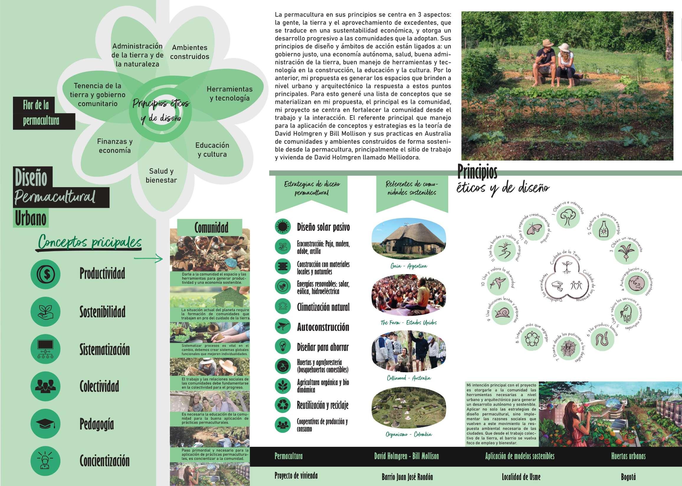 The project presents a research developed during the ninth and tenth semesters of architecture, focused on improving the Juan José Rondón neighborhood in Usme. The project methodology is detailed, including urban, architectural and social aspects. Problems were identified such as economic vulnerability and lack of habitability in self-construction and temporary housing. Key questions arose about how to address these needs and improve quality of life holistically. The proposed response was permaculture, which seeks sustainable solutions addressing social, economic and environmental aspects. Principles such as productivity, sustainability, collectivity and pedagogy are highlighted. Permacultural strategies are mentioned such as passive solar design, construction with local materials, among others. References are taken from permacultural communities worldwide. A challenge arises in reducing urban density due to the permacultural proposal. Finally, objectives are established to change the lifestyle in the neighborhood, promoting urban agricultural work and economic freedom through productive spaces.