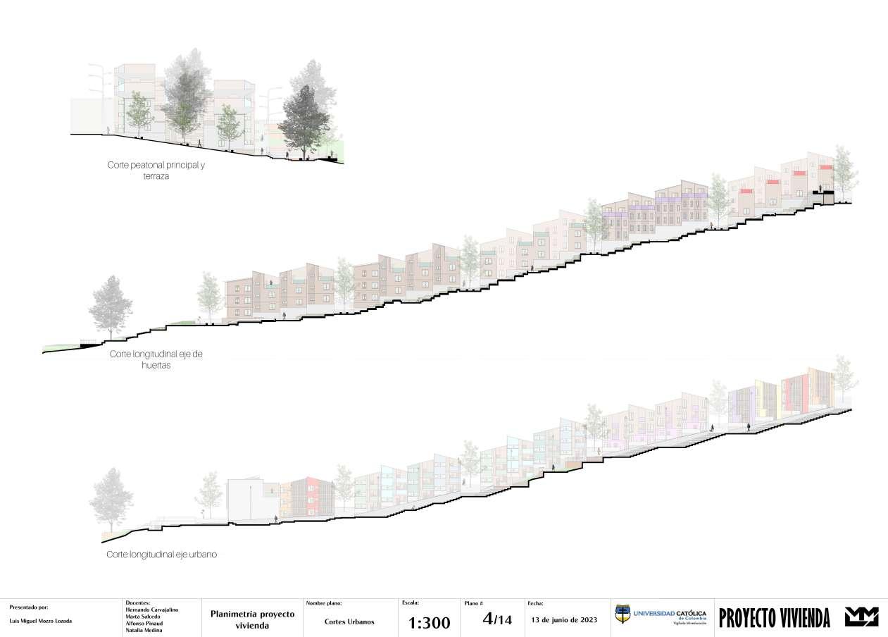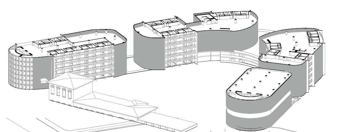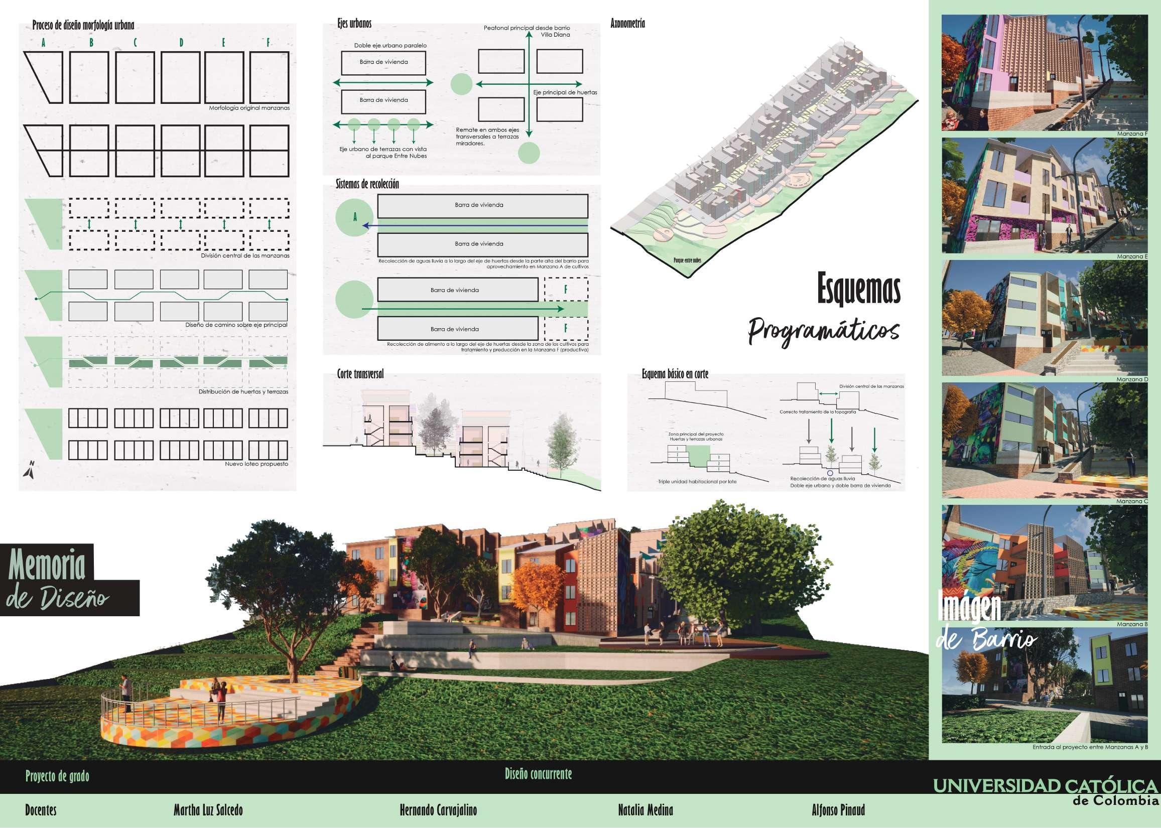 Fifth semester. Modification and adaptation of a set of blocks in the Sosiego neighborhood in the town of San Cristóbal in Bogotá. With the modification of 4 blocks, a large block was created with 3 collective housing buildings that function together. This will serve the inhabitants of the area and the users for whom the housing space is intended, in a cultural, social, commercial and recreational way. With spaces for sports, recreation, rest, cultural events in outdoor and indoor spaces, local commerce centers, libraries, among others, the social inclusion of communities disadvantaged by the armed conflict in Colombia is sought, and the good development of the urban life in the capital. The shape of the buildings is based on the towers of the Park by the Colombian architect Rogelio Salmona, who with circular and fanned figures takes great advantage of the visuals of the environment and the empty spaces of the city. This fan shape in the 3 projects rises to highlight the views of the Fucha River and the eastern hills, and at the same time, its orientation takes advantage of the entry of light into the apartments and the distribution of air within them. The block typology is of blocks isolated from the facing, since it moves away from the edges of the block to give way to public life.