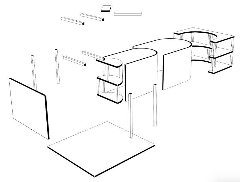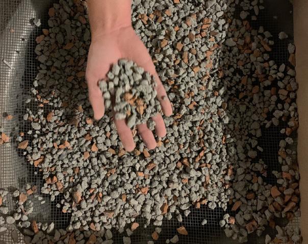 A partir disso, foi desenvolvido um módulo de mobiliário feito de concreto com britas de RDC. Dentro dos RCD (resíduos de construção e demolição) foi selecionado a categoria A para ser utilizada: tijolos, telhas, cerâmicas, concretos, areia e outros materiais trituráveis. Para que esses detritos sejam capazes de serem úteis para a produção, é necessário que haja sua britagem e, assim, feita a concretagem.