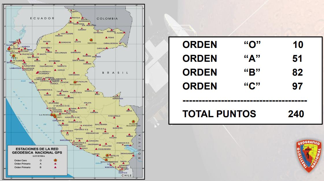 INSTITUTO GEOGRÁFICO NACIONAL SNCP | CATASTRO BORJA | CARRION | FERNANDEZ | MALPARTIDA | OSORIO | ZEA G E O M Á T I C A | E S T S E N C I C O RED GEODÉSICA GEOCÉNTRICA NACIONAL | REGGEN EN LA ACTUALIDAD SE TIENE EN EL PERU 24 ESTACIONES DE OPERACION CONTINUA, 21 ACTIVAS Y 3 REMOVIDAS, TAL CUAL SE PUEDE CORROBORAR EN LA WEB OFICIAL DEL SIRGAS HTTPS://WWW.SIRGAS.ORG/ES /STATIONS/STATION-LIST/