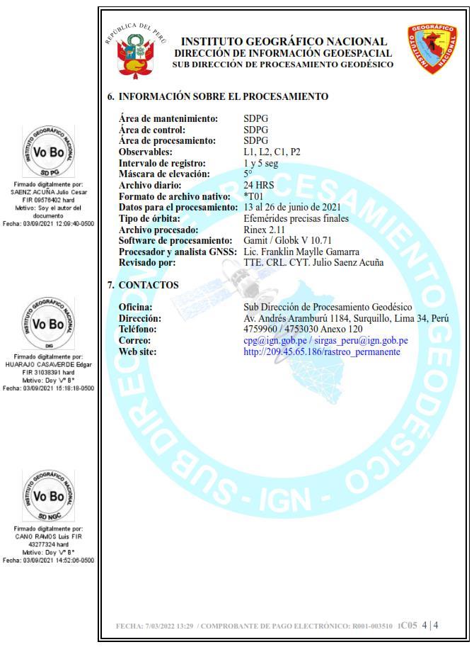 • De acuerdo con el informe de procesamiento en ajuste de línea Base, se concluye que las coordenadas finales del punto, fue obtenido de acuerdo con las normas técnicas para este Orden “C” de puntos geodésicos.