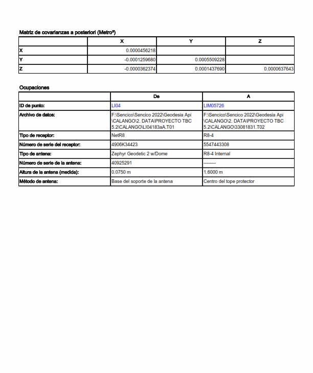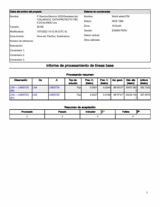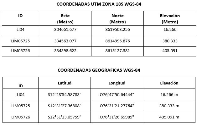 Empleando técnicas de posicionamiento diferencial en post procesamiento se determinaron las coordenadas geográficas y UTM zona 18 Sur en el sistema WGS 84, la elevación para los puntos es calculada con el modelo geopotencial de la Tierra EGM2008 (Earth Gravitational Model 1996), los informes de las líneas base generadas para los puntos Rover “LIM05725” Y “LIM05726”, se muestran en el Anexo N° 02.
