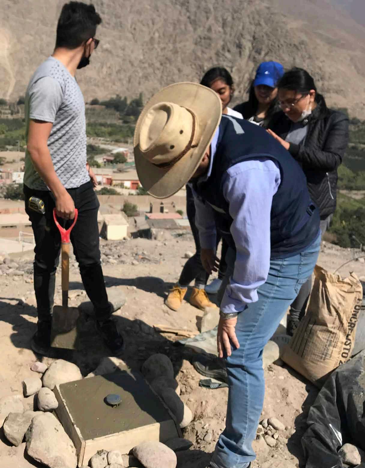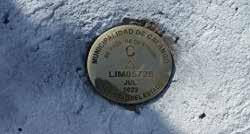 • Luego se procedió a monumentar los hitos con una medida de 0.40x0.40 mts. y al medio del concreto fue incrustado un disco de bronce de 7 cm de diámetro con la descripción del código asignado por el Instituto Geográfico Nacional.
