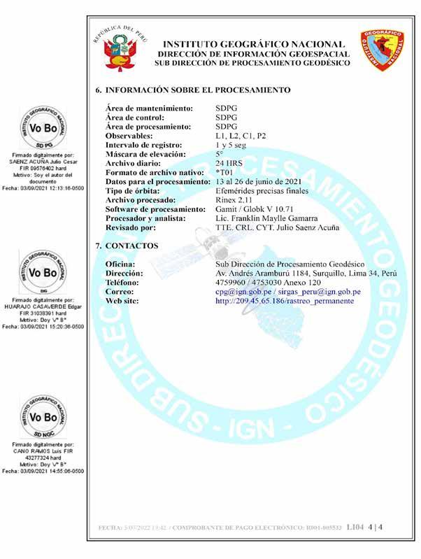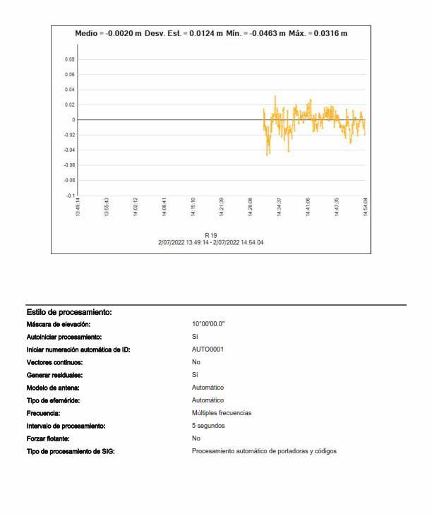 • En los resultados del procesamiento se obtuvo como precisión vertical 0.019 metros y precisión Horizontal 0.003 metros empleando un tipo de solución fija con un intervalo de procesamiento de 5 segundos cumpliendo con lo establecido en el ítem 3.2.5 Cálculos de gabinete.