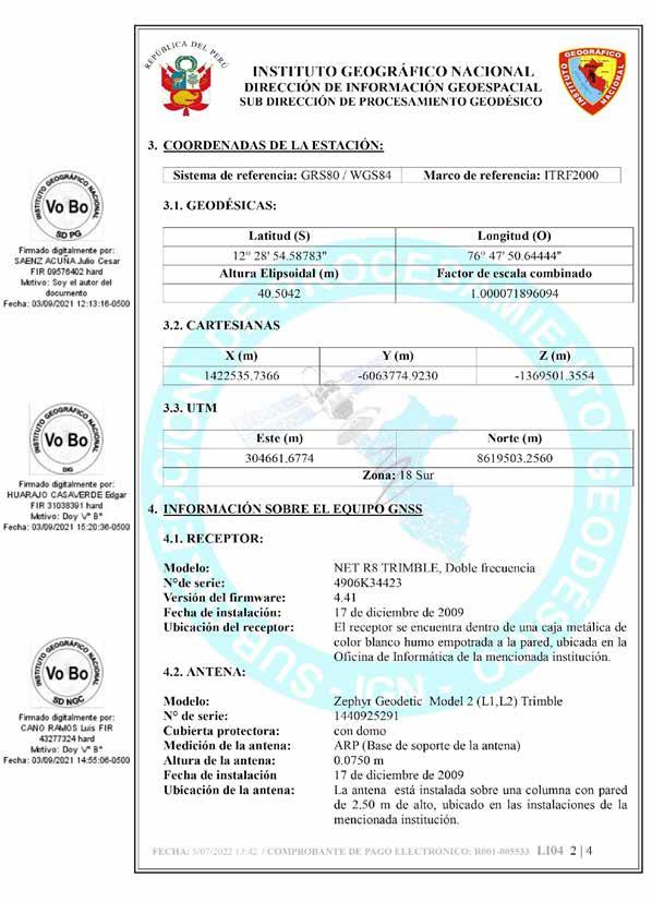 COORDENADAS UTM WGS 84 Punto Este (X) Norte (Y) ZONA LI04 304661.6774 8619503.2560 18 Sur COORDENADAS GEODESICAS WGS 84 Punto Latitud Longitud Altura Elipsoidal LI04 12° 28' 54.58783 '' 76° 47' 50.64444 '' 40.5042