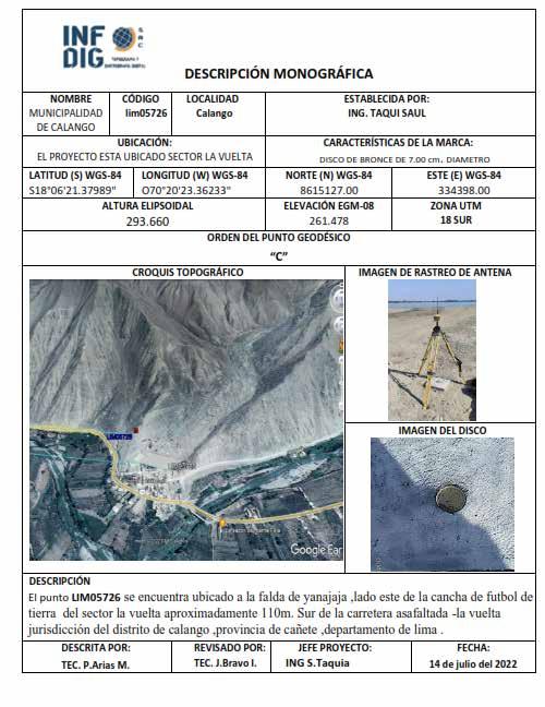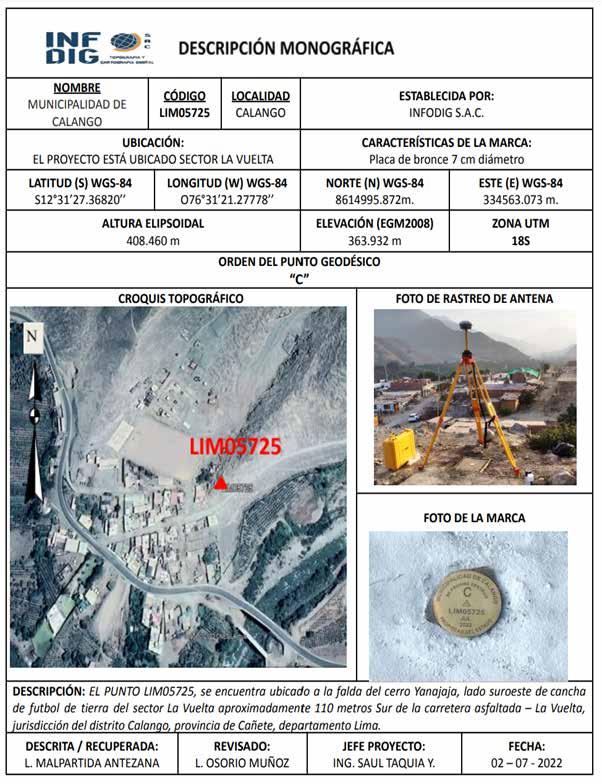 En el terreno se determinaron dos puntos, denominados “LIM05725” Y “LIM05726” ubicado en la Jurisdicción del distrito Calango, provincia de Cañete, departamento de Lima, los cuales están materializados con concreto armado y placas de Bronce.